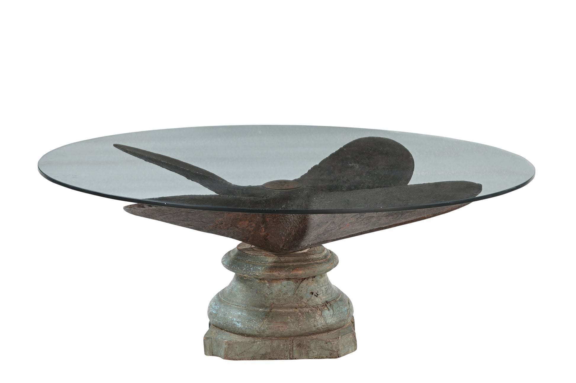 Fabricada a partir de una hélice de barco indio recuperada y rematada con vidrio templado, esta mesa de centro combina la herencia industrial y el diseño contemporáneo en una pieza inolvidable.