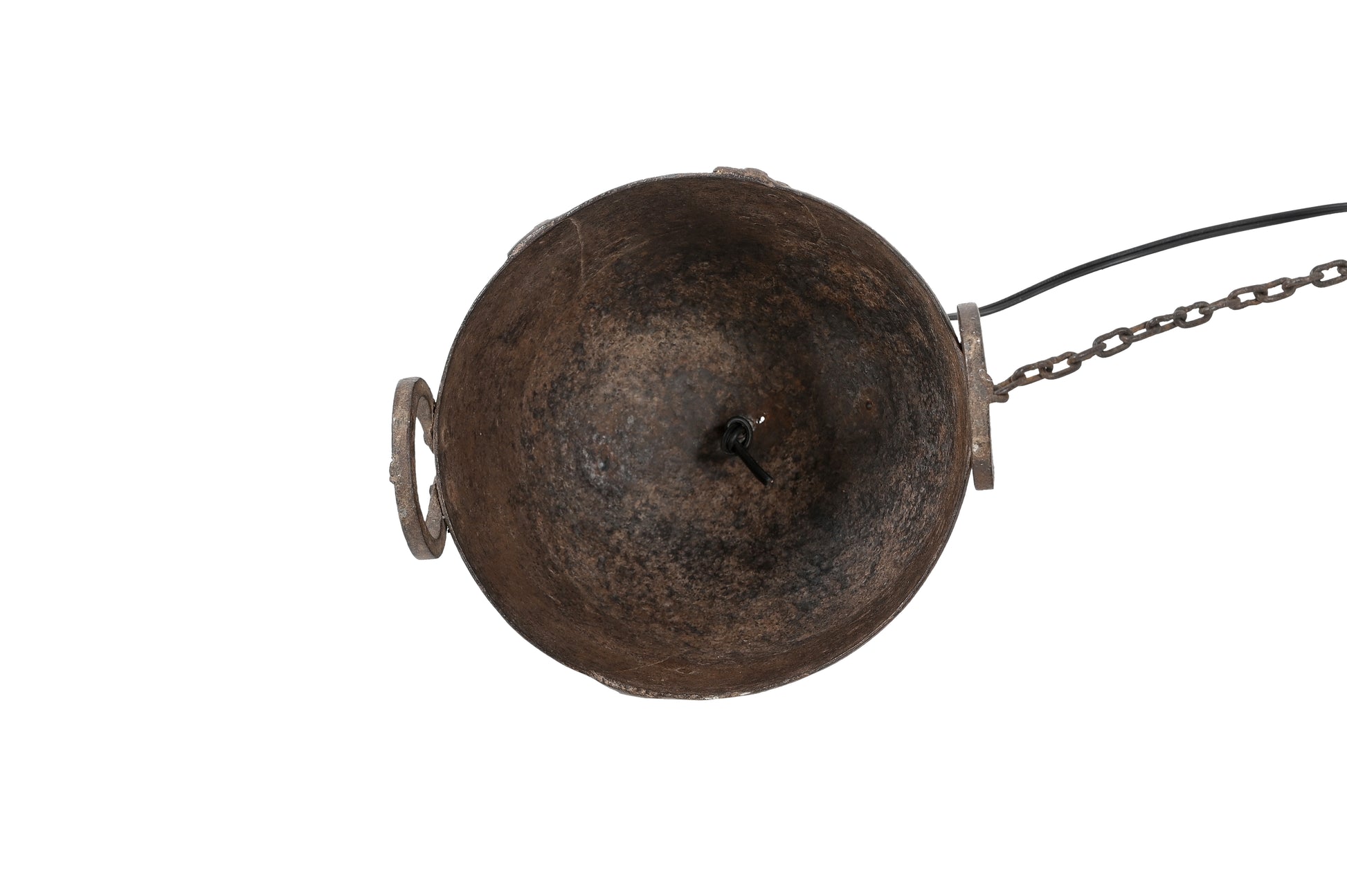 Antiguamente utilizado para extraer agua de profundos pozos indígenas, este cubo de hierro macizo se ha reconvertido en una llamativa lámpara colgante. Su textura, pátina envejecida y asas de aro originales cuentan una historia de utilidad y transformación.