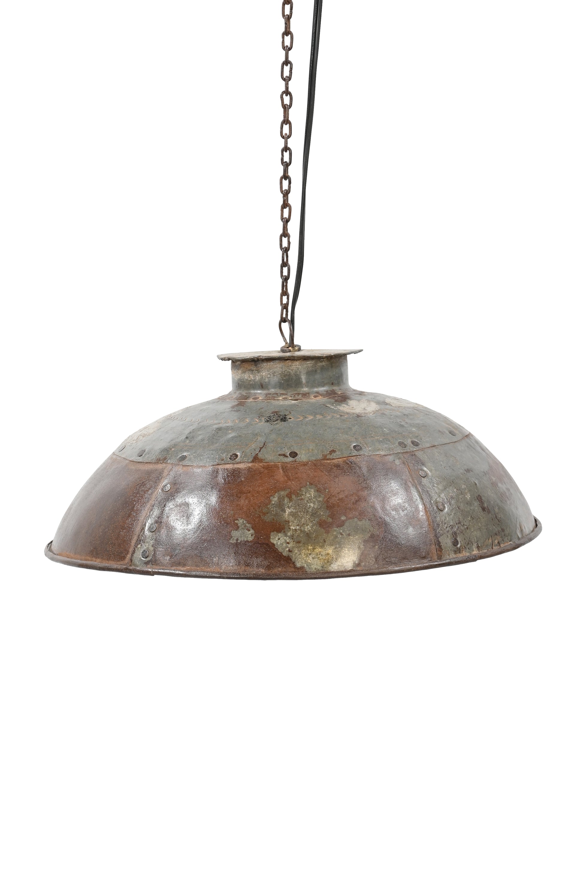 Fabricada a partir de paneles de hierro remachados a mano, la superficie de patchwork de esta pantalla de lámpara muestra las marcas del tiempo con óxido natural, capas de metal patinadas expuestas con tonos marrones, grises y acero.