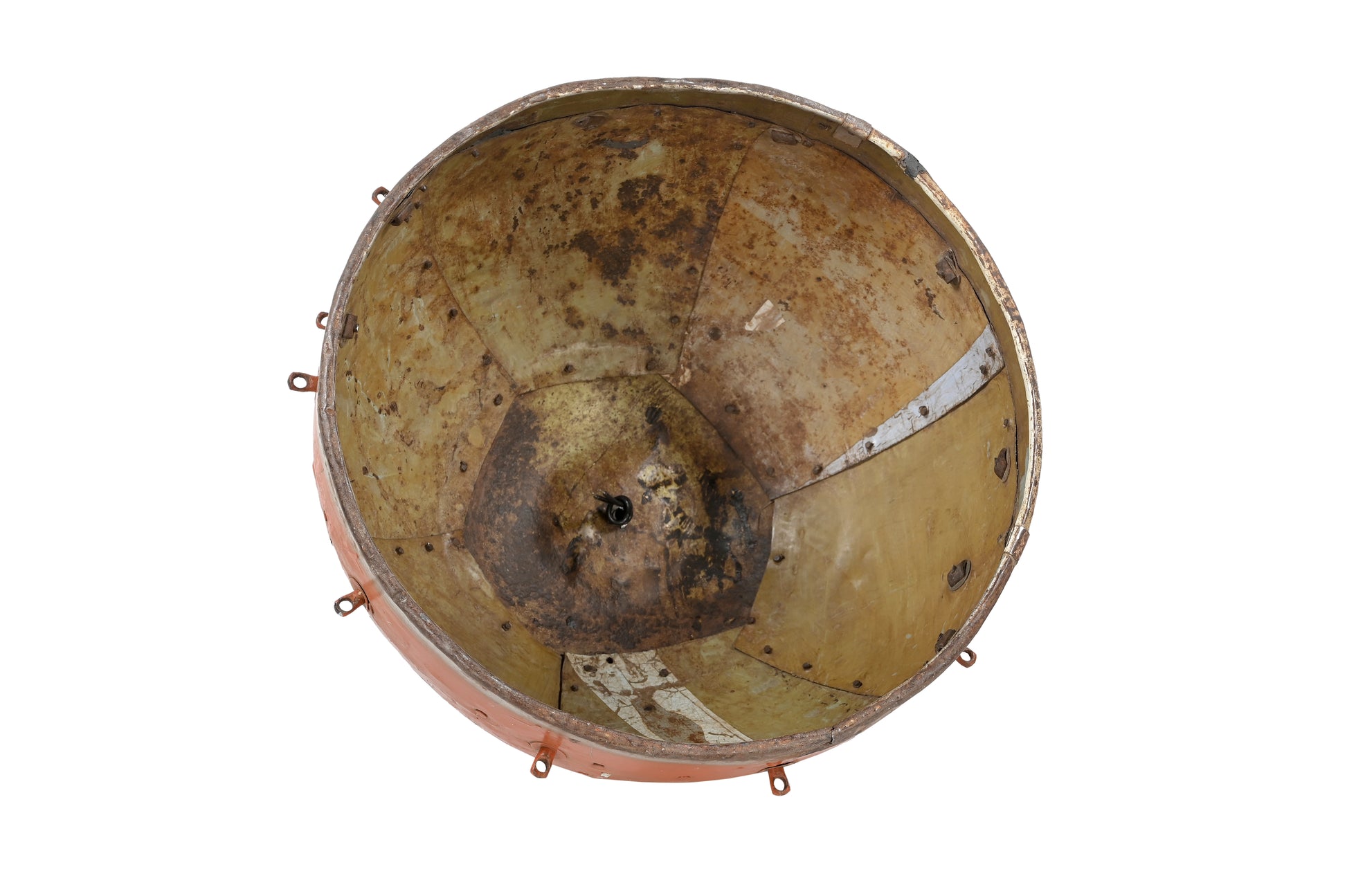 La pantalla de la lámpara, ahora un colgante con forma de cúpula, alguna vez fue un tambor tabla tradicional de la India, un instrumento utilizado para marcar ritmo y armonía.