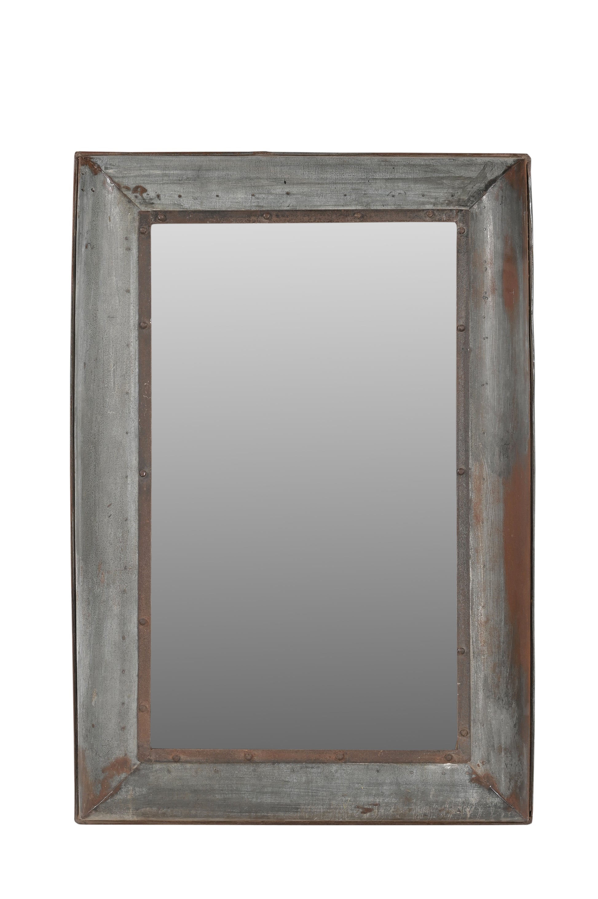 Con sus esquinas oxidadas y sus costuras soldadas, este espejo de estilo industrial sin complejos es realmente una pieza única.
