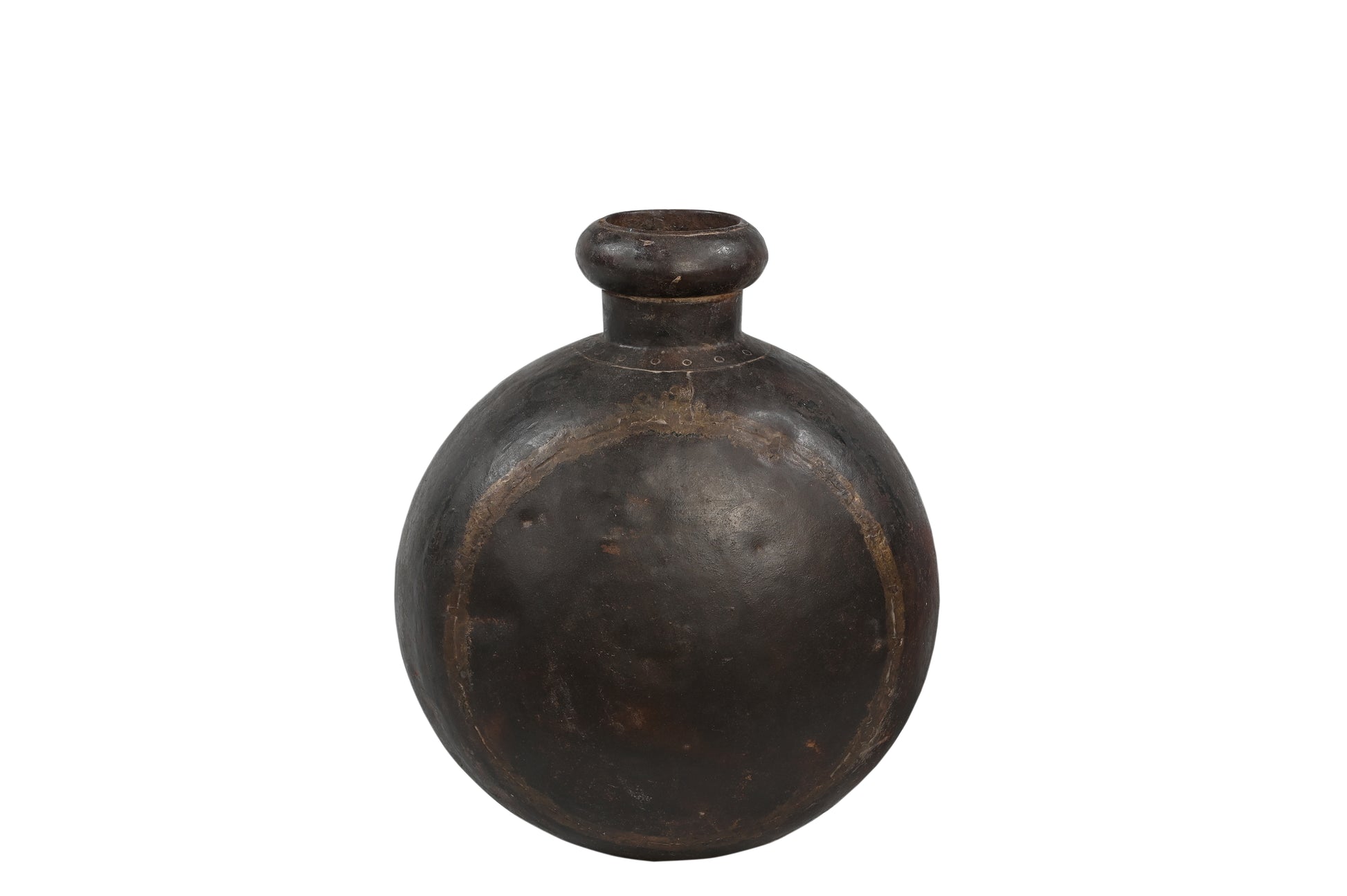 Históricamente, esta olla antigua se habría utilizado para almacenar agua y quizás aceite. Forjada a mano en hierro macizo, conserva una crudeza suavizada por el tiempo.