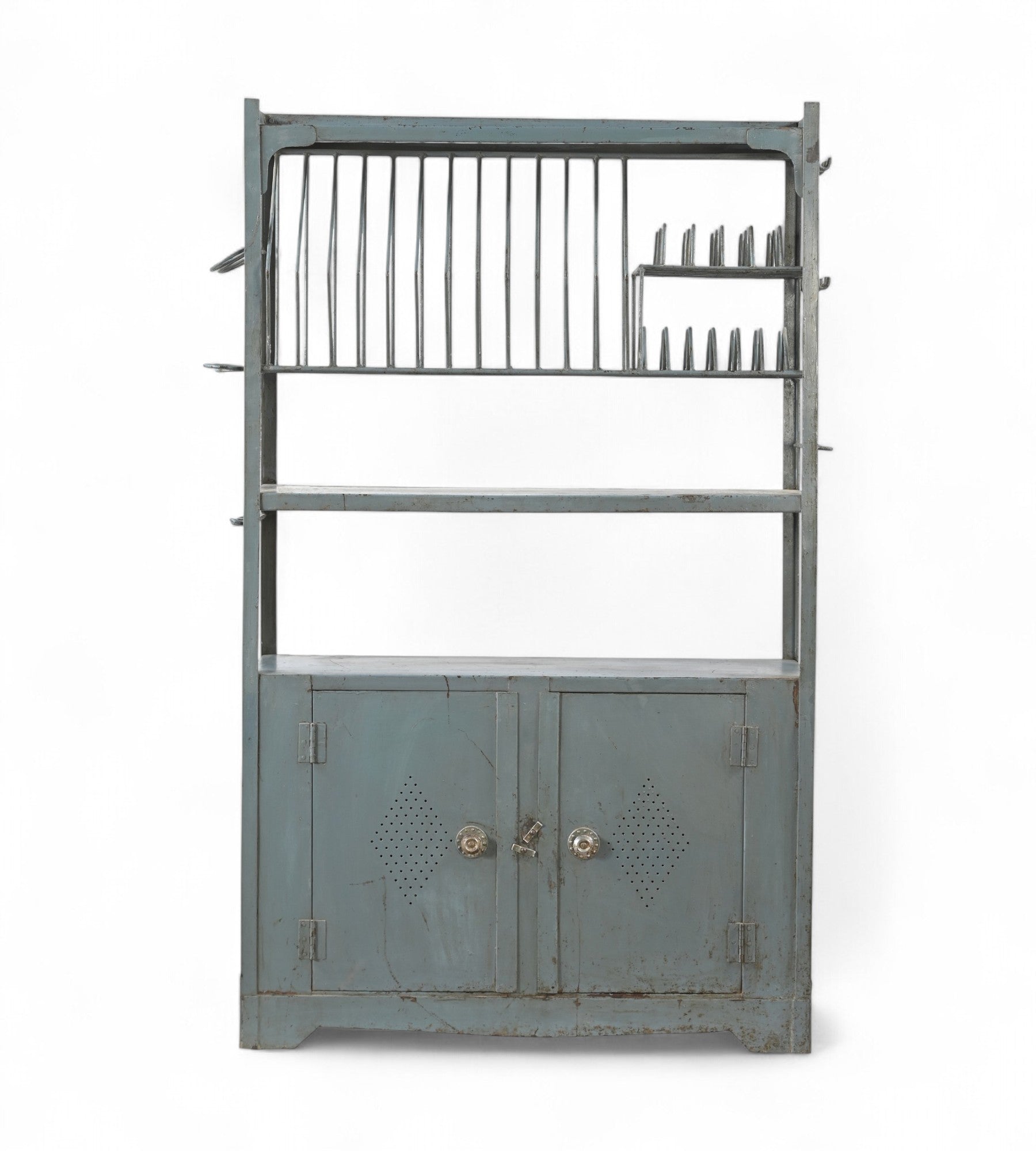 Con ranuras para platos integradas, ganchos para tazas y un gabinete inferior para almacenamiento, esta pieza única aporta una rica historia a su cocina.