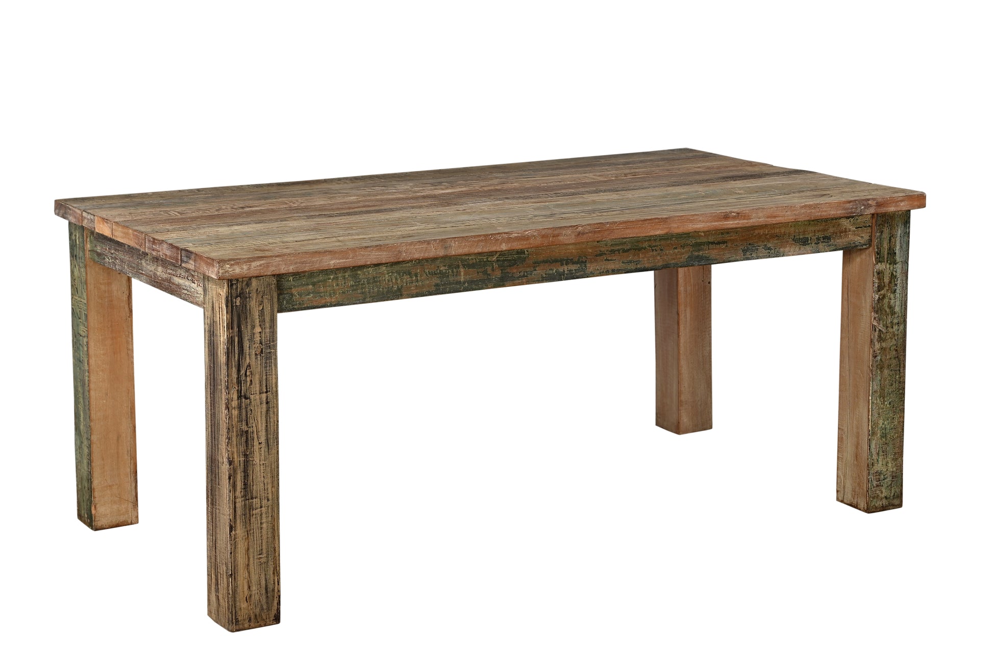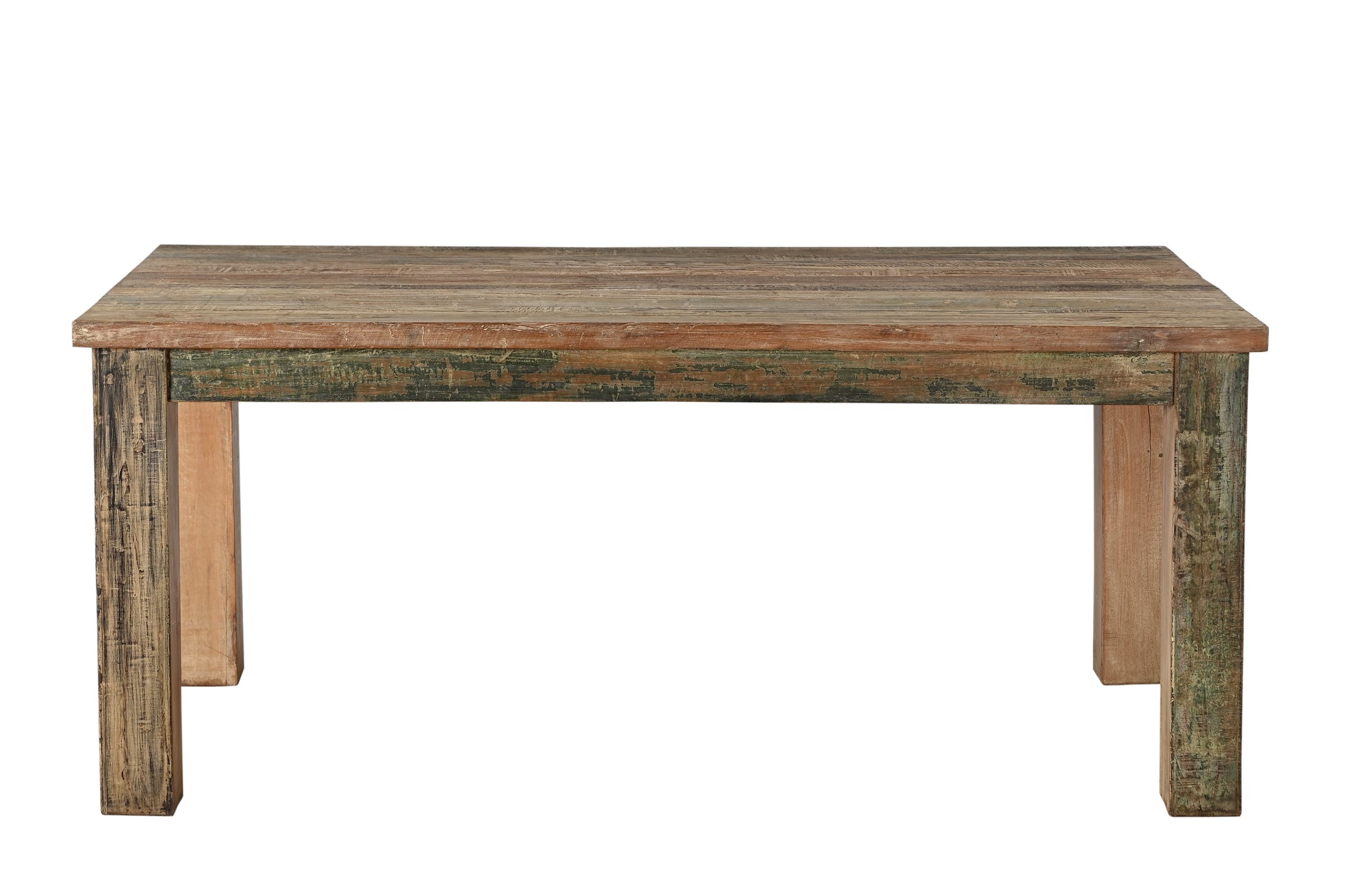 Esta mesa de madera maciza está hecha a mano con madera reciclada de la India. Esta pieza luce una rica pátina de pintura en capas (marrones, verdes, toques de amarillo) con sutiles imperfecciones que la hacen única.