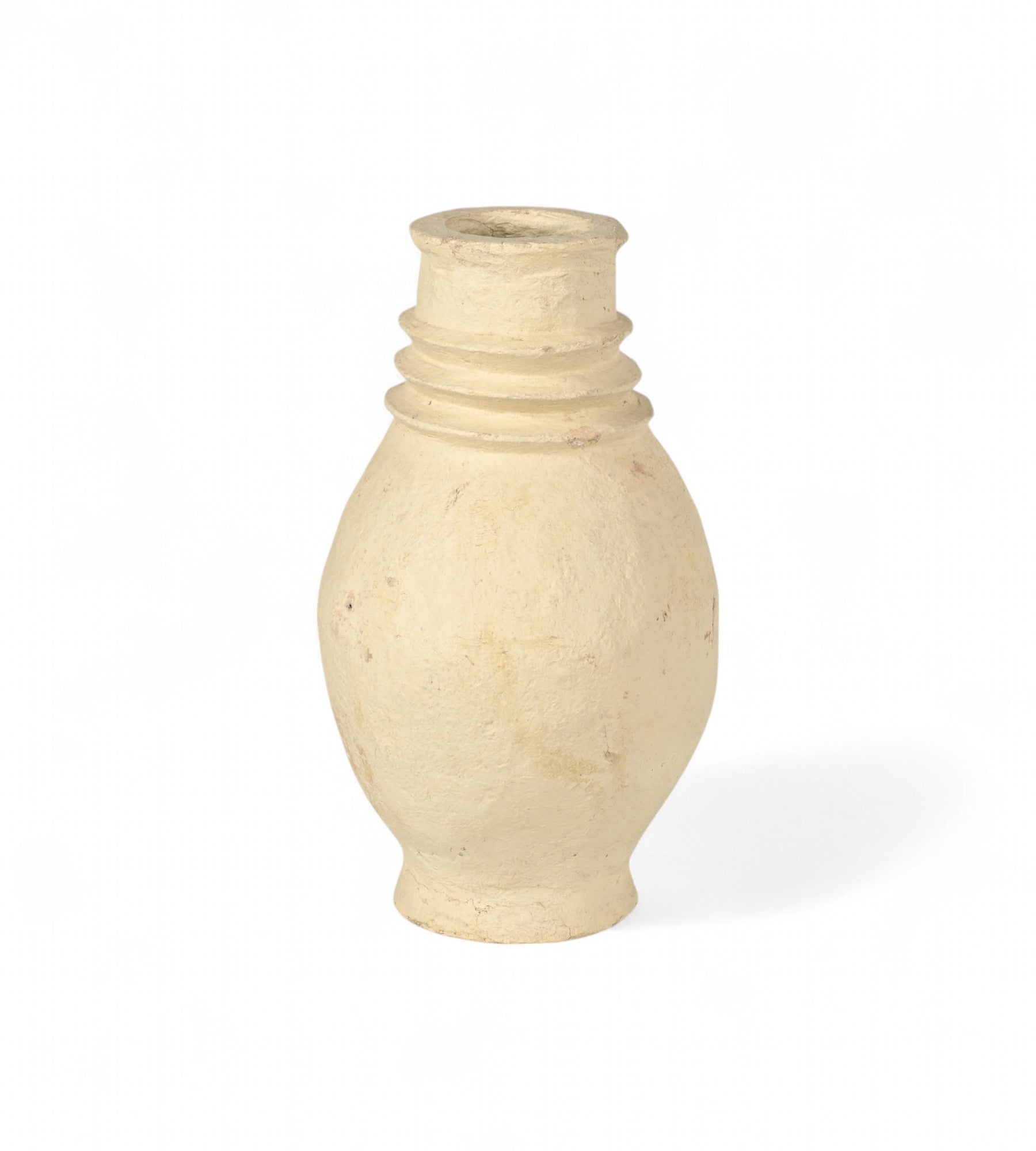Esta maceta ligera y llena de carácter de papel maché ha sido moldeada a mano en la India. Su suave tono blanco la hace ideal para cualquier espacio interior. La superficie presenta imperfecciones y ondulaciones propias del proceso artesanal, lo que le confiere una textura terrosa.