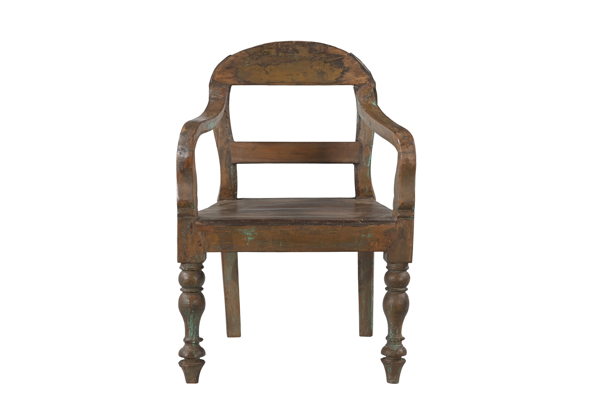 El respaldo elegantemente arqueado, los apoyabrazos suavemente arqueados y las patas torneadas reflejan la artesanía tradicional india, mientras que el acabado desgastado y los tenues rastros de pintura verde cuentan una historia de generaciones pasadas.