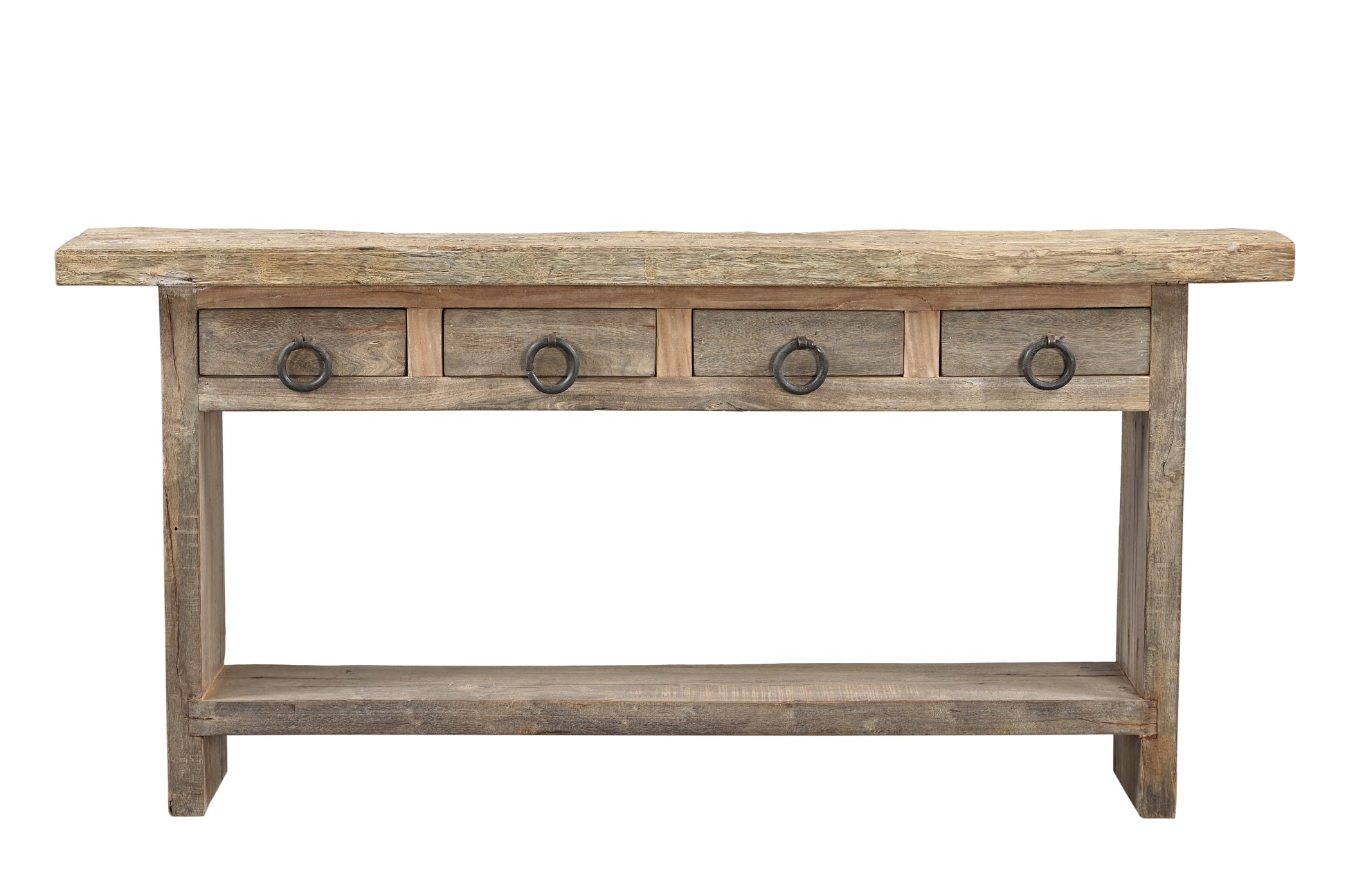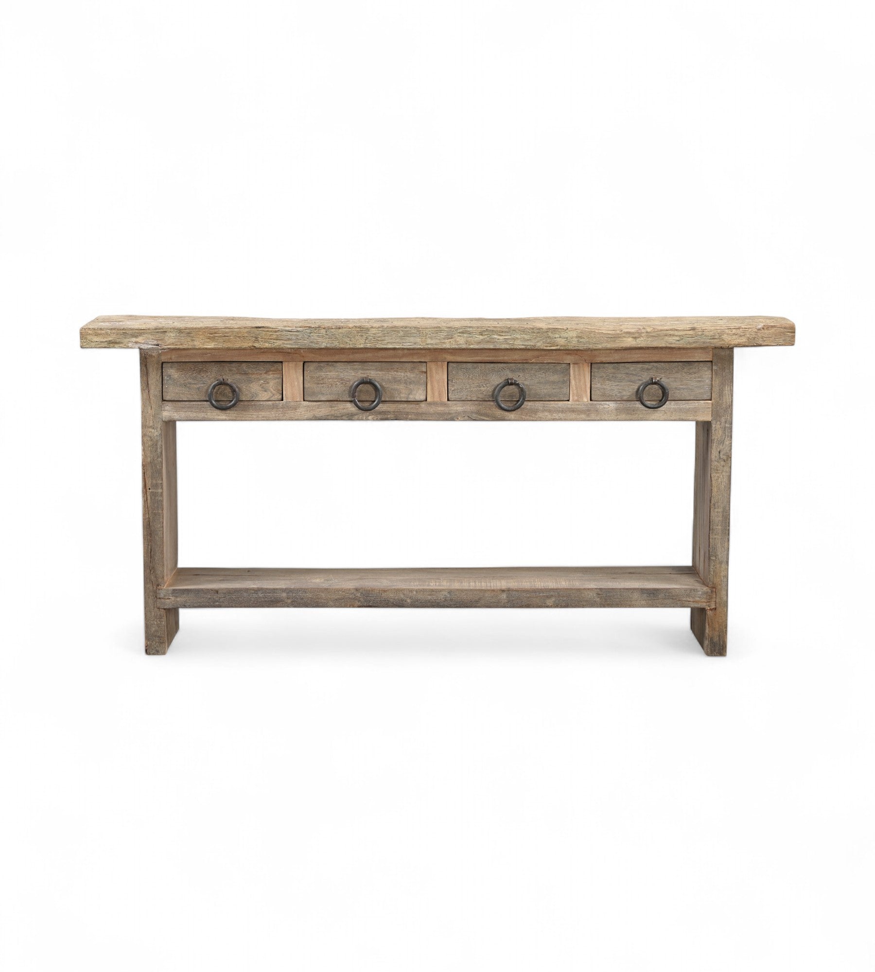 El cálido acabado lavado por el sol y la textura desgastada naturalmente de esta mesa consola la convierten en una opción versátil para interiores modernos.
