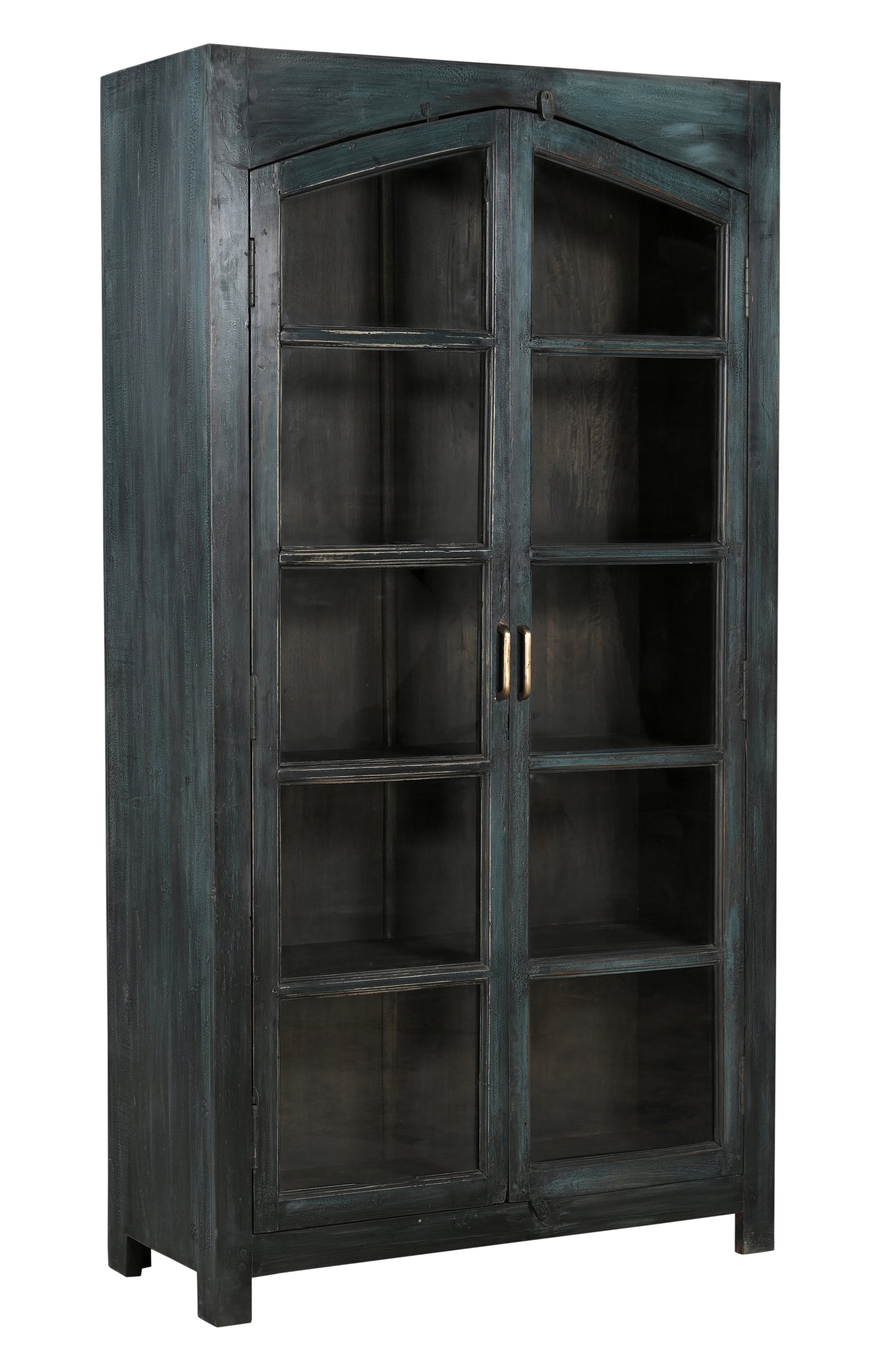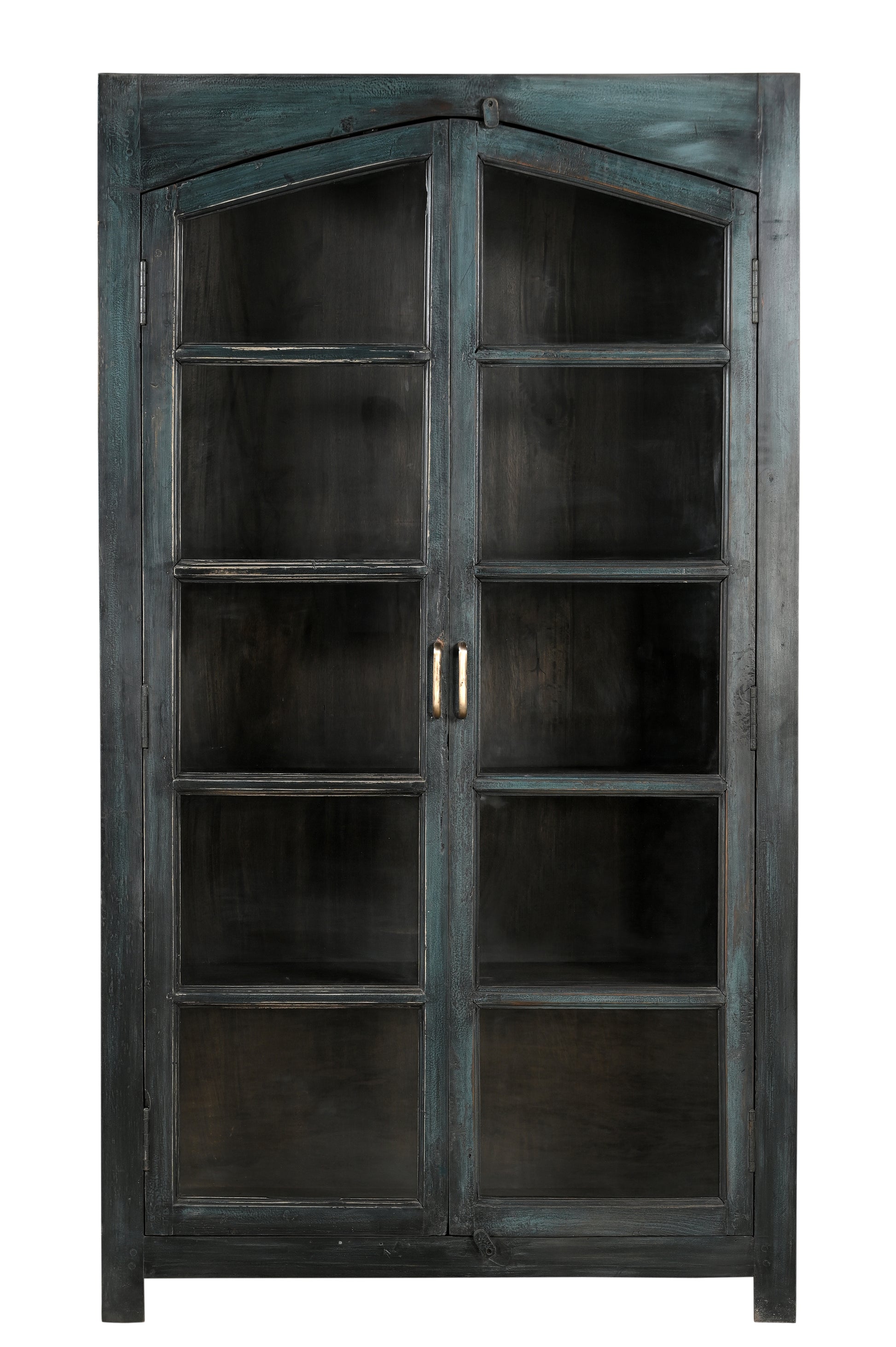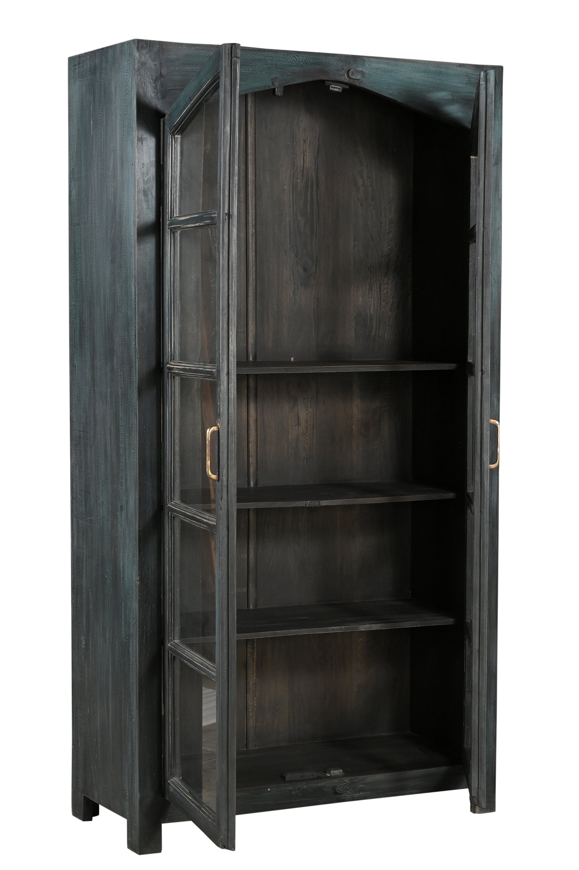 Hecha a mano en teca maciza, esta vitrina presenta un acabado en ricos y profundos tonos carbón y esmeralda. Las puertas arqueadas de cristal invitan a exhibir sus objetos más preciados, mientras que las estanterías interiores ofrecen un amplio espacio de almacenamiento.