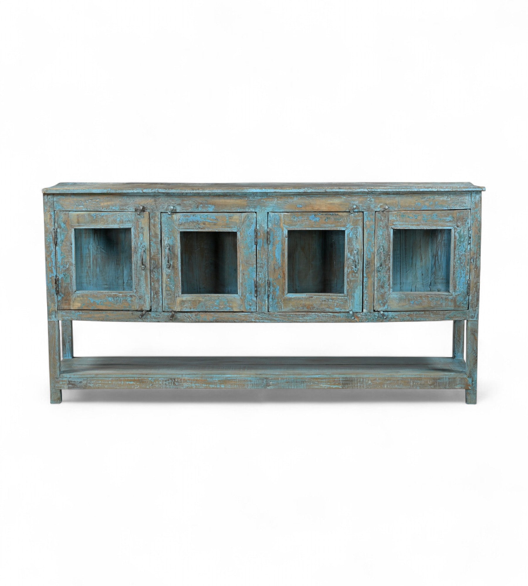 Este aparador vintage único de madera recuperada es una obra maestra de carácter. Hecho a mano y lavado a mano con tonos azules y multicolores en Jodhpur, esta pieza logra el equilibrio perfecto entre encanto rústico y presencia audaz.