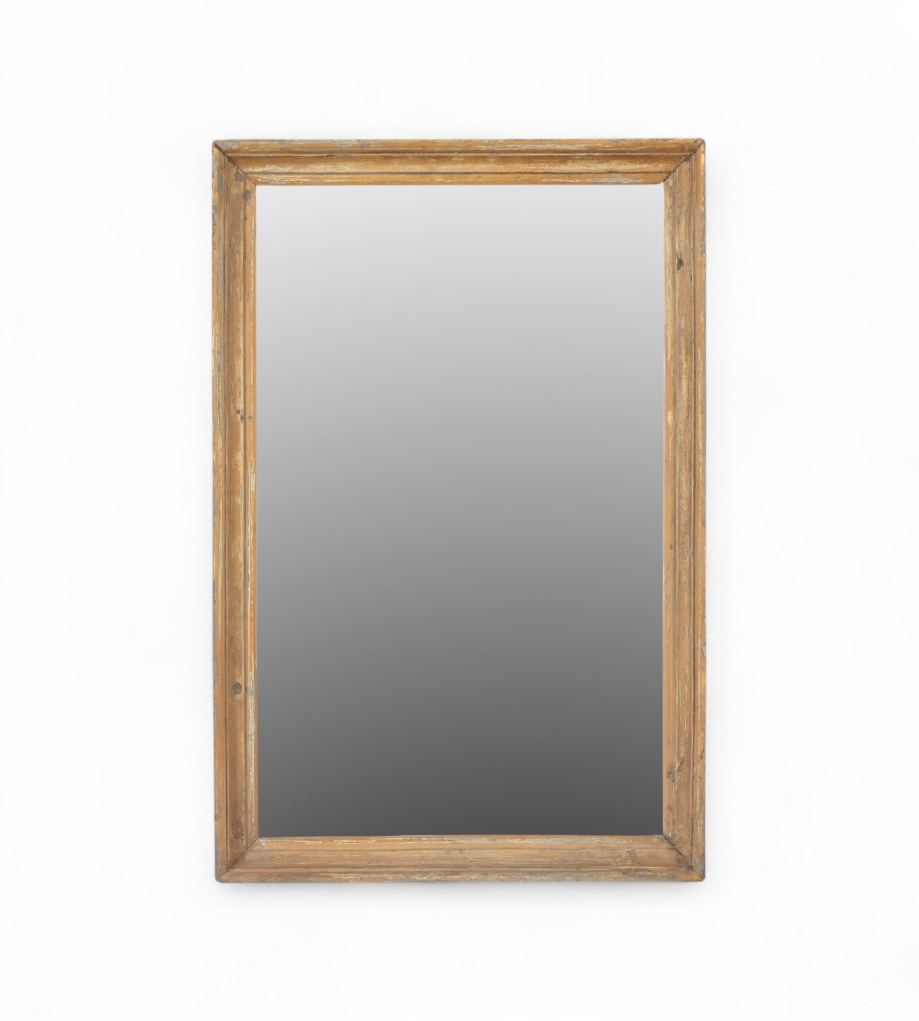 Este espejo vintage fue elaborado a mano en la India con madera de teca. Presenta un tono dorado y vetas visibles con sutiles rastros del pasado.