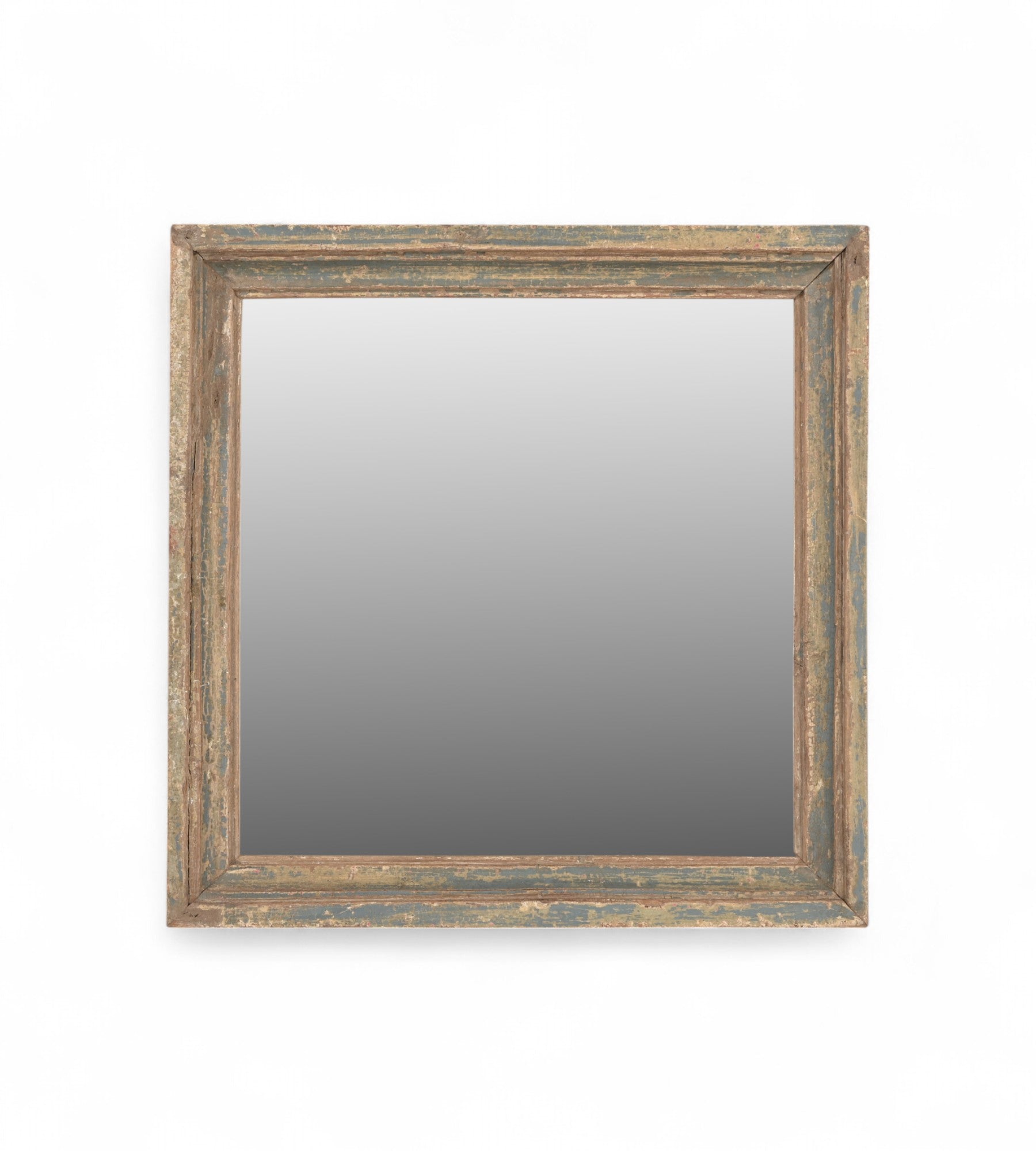 Discreto, este espejo cuadrado está enmarcado en teca maciza vintage con un acabado suavemente desgastado, con rastros de verdes, azules y amarillos.