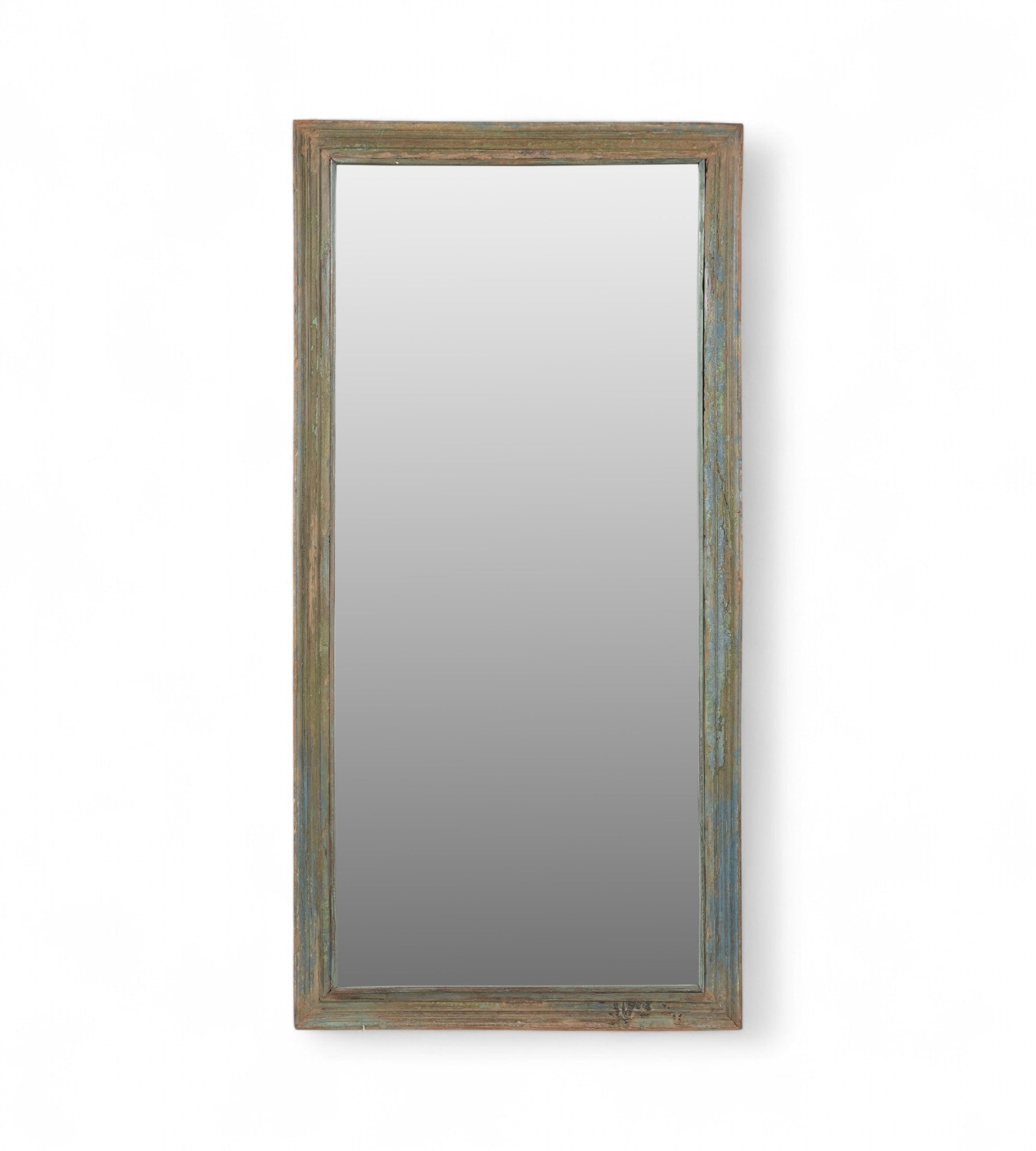Este espejo alto vintage, enmarcado en teca india, presenta un acabado naturalmente desgastado con suaves tonos verdes, azules y terrosos.