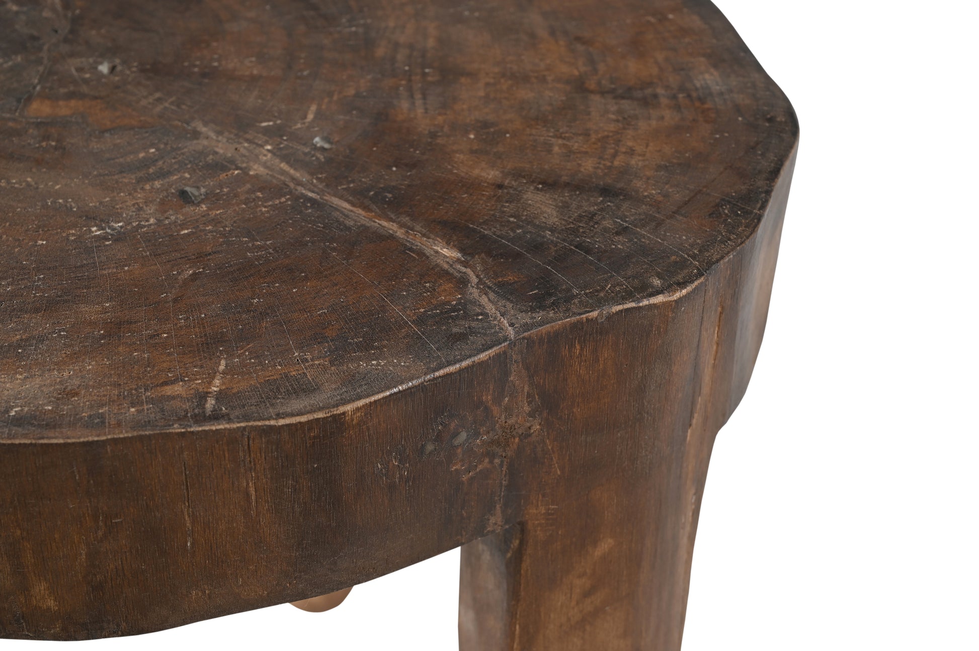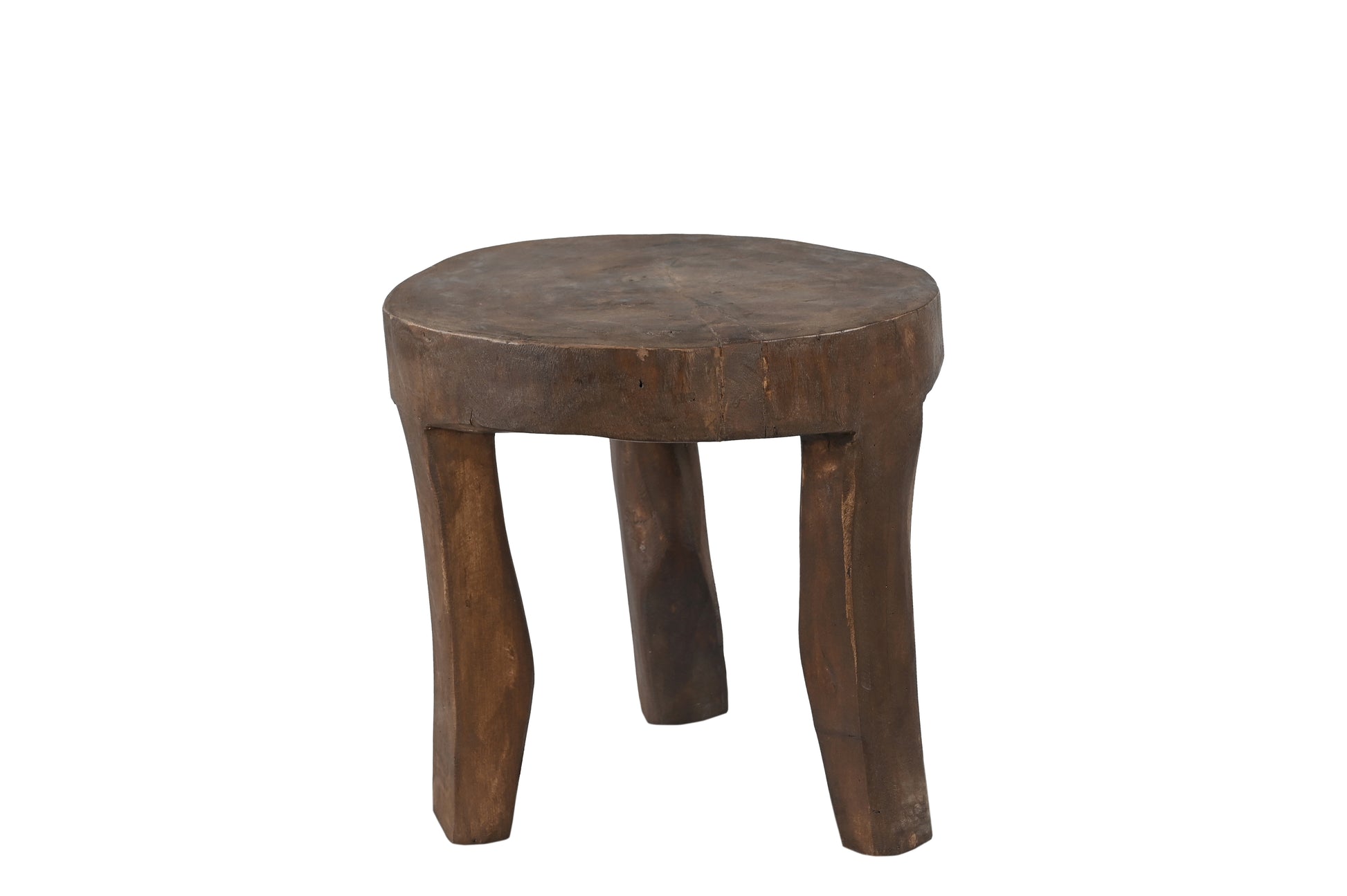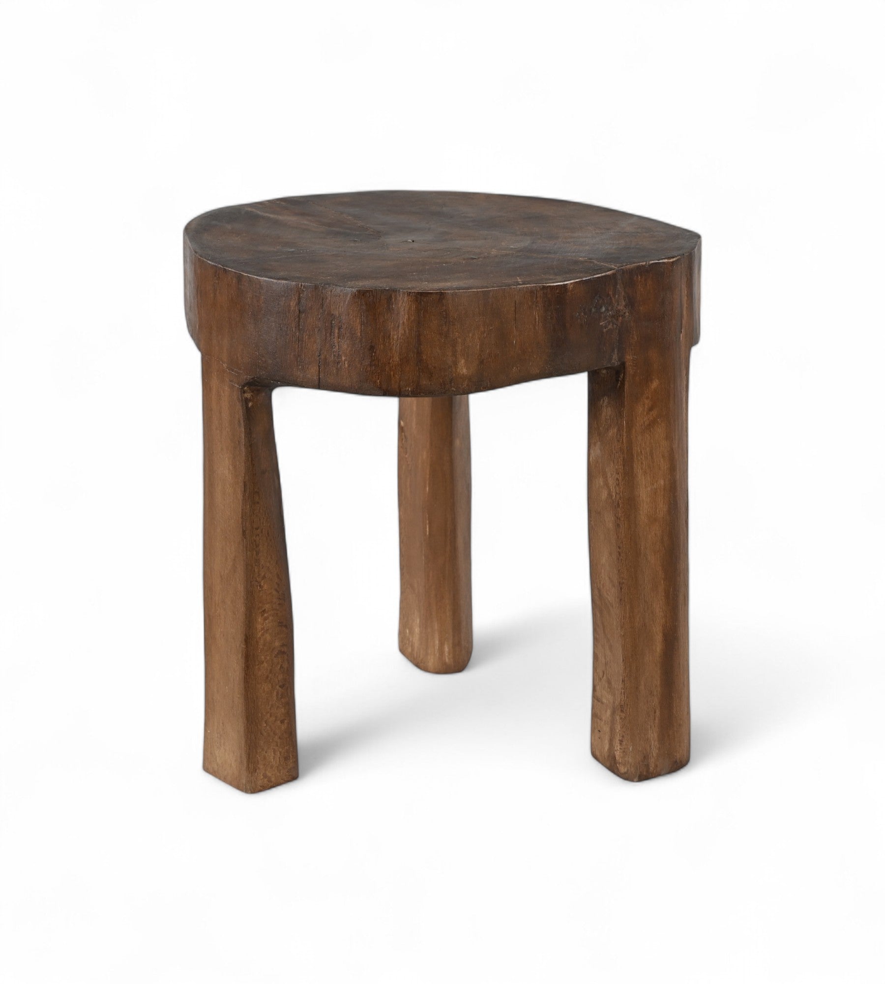 La forma orgánica y la rica pátina oscura de este taburete indio vintage aportan calidez y alma a cualquier espacio. Tallado a mano en una sola pieza de madera de teca, el taburete irradia un aire artesanal con sus patas de forma irregular y veta agrietada.