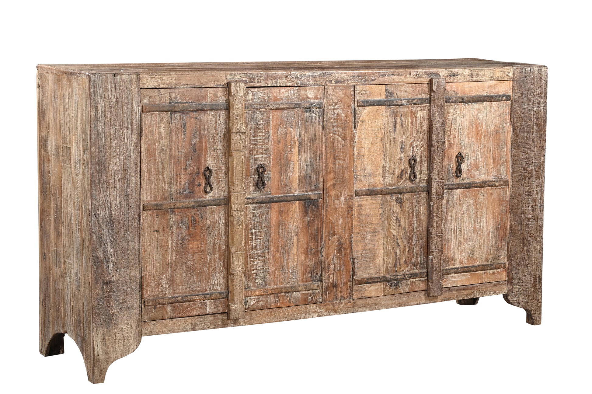 Este impresionante aparador fue elaborado artesanalmente en la India con teca maciza recuperada, y cada panel muestra el delicado desgaste del tiempo. Con cuatro puertas con paneles, tiradores de hierro forjado a mano y amplios estantes interiores, esta pieza combina arte y funcionalidad.