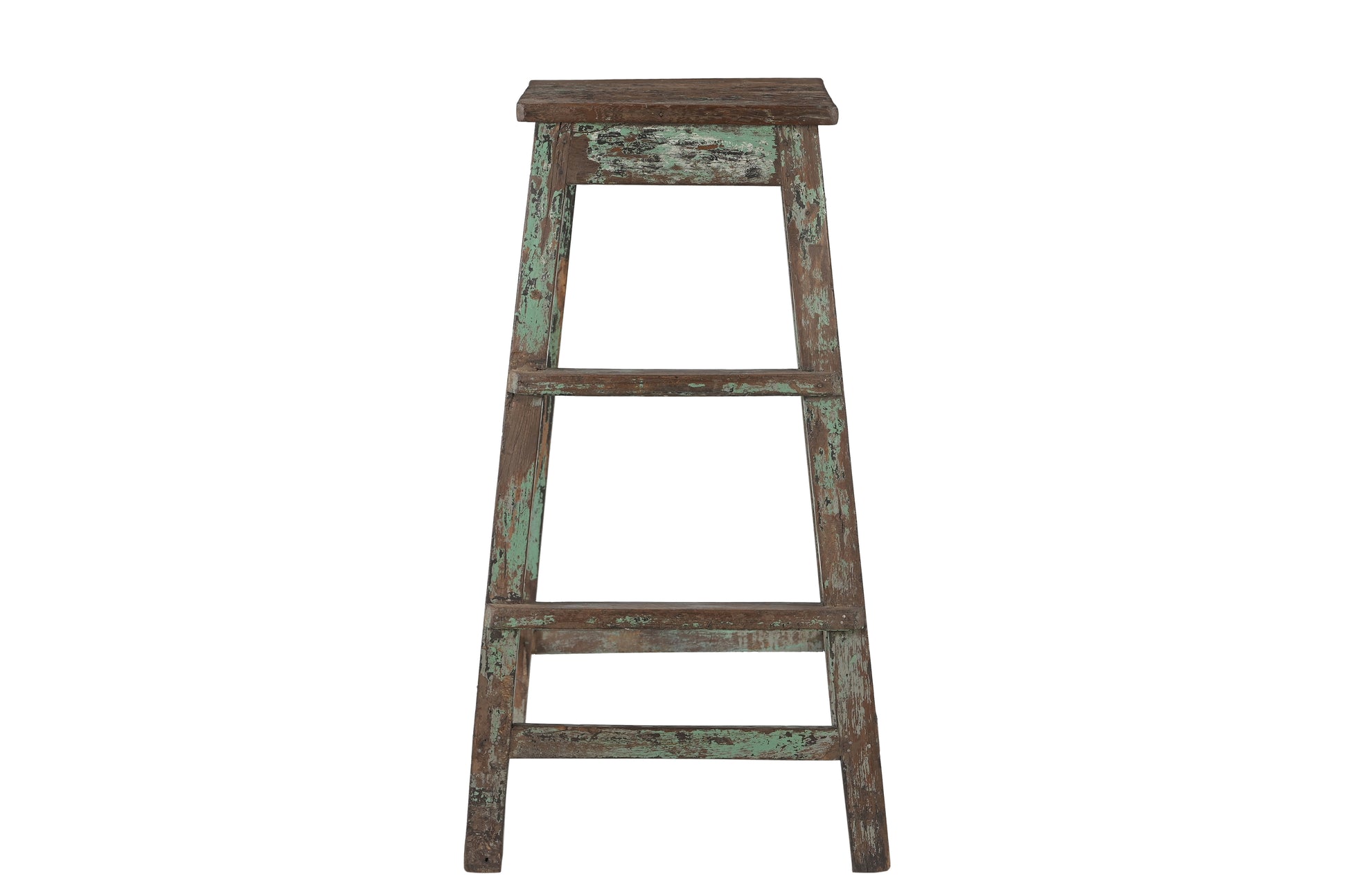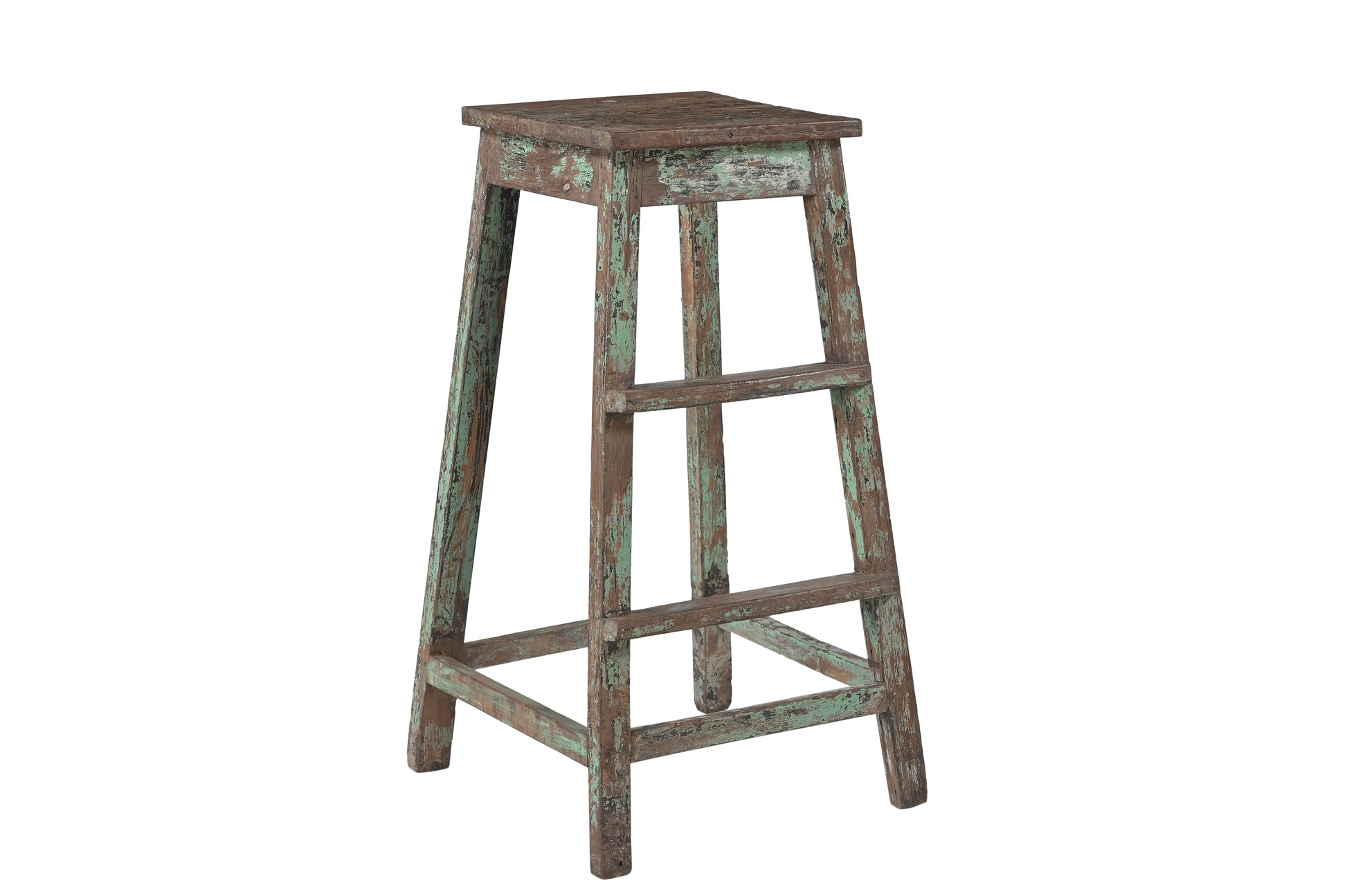 Crafted form solid teak and worn beautifully over time, this vintage stool brings both utility and character. A faded green patina layers over the natural timber brown tone, telling a story of age and use.