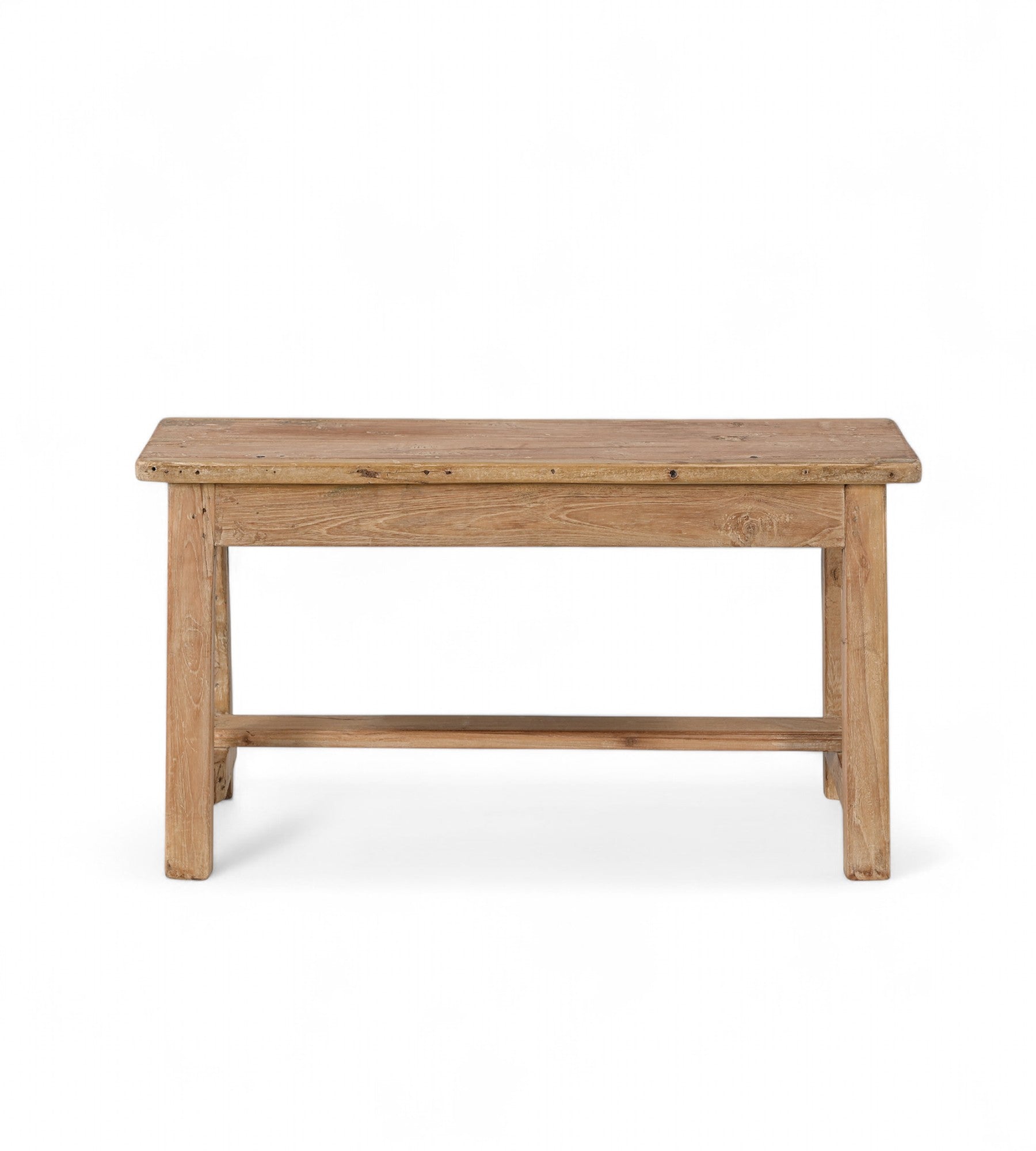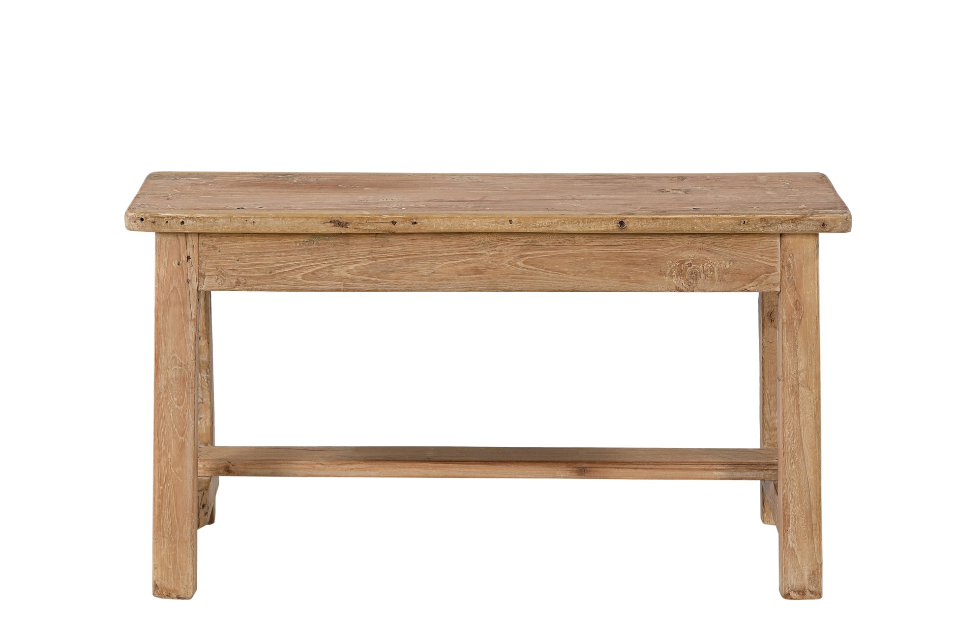 The vintage teak bench was handcrafted in India. With its natural finish, the light tone brightens a space providing bundles of character.