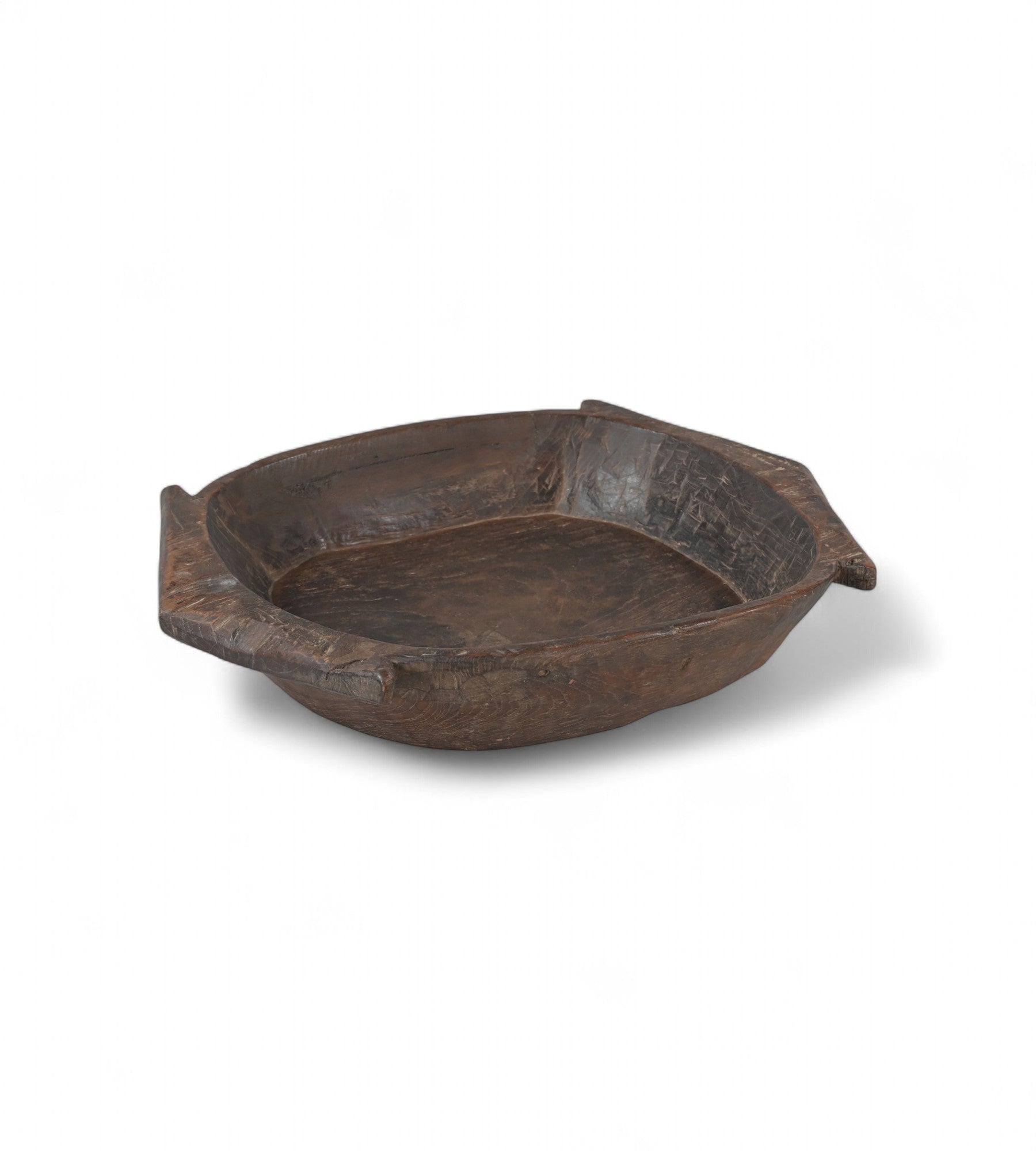 This piece stands out with its angular silhouette and integrated carved handles and deep wide basin - today reimagined as a decorative piece or small serving plate.