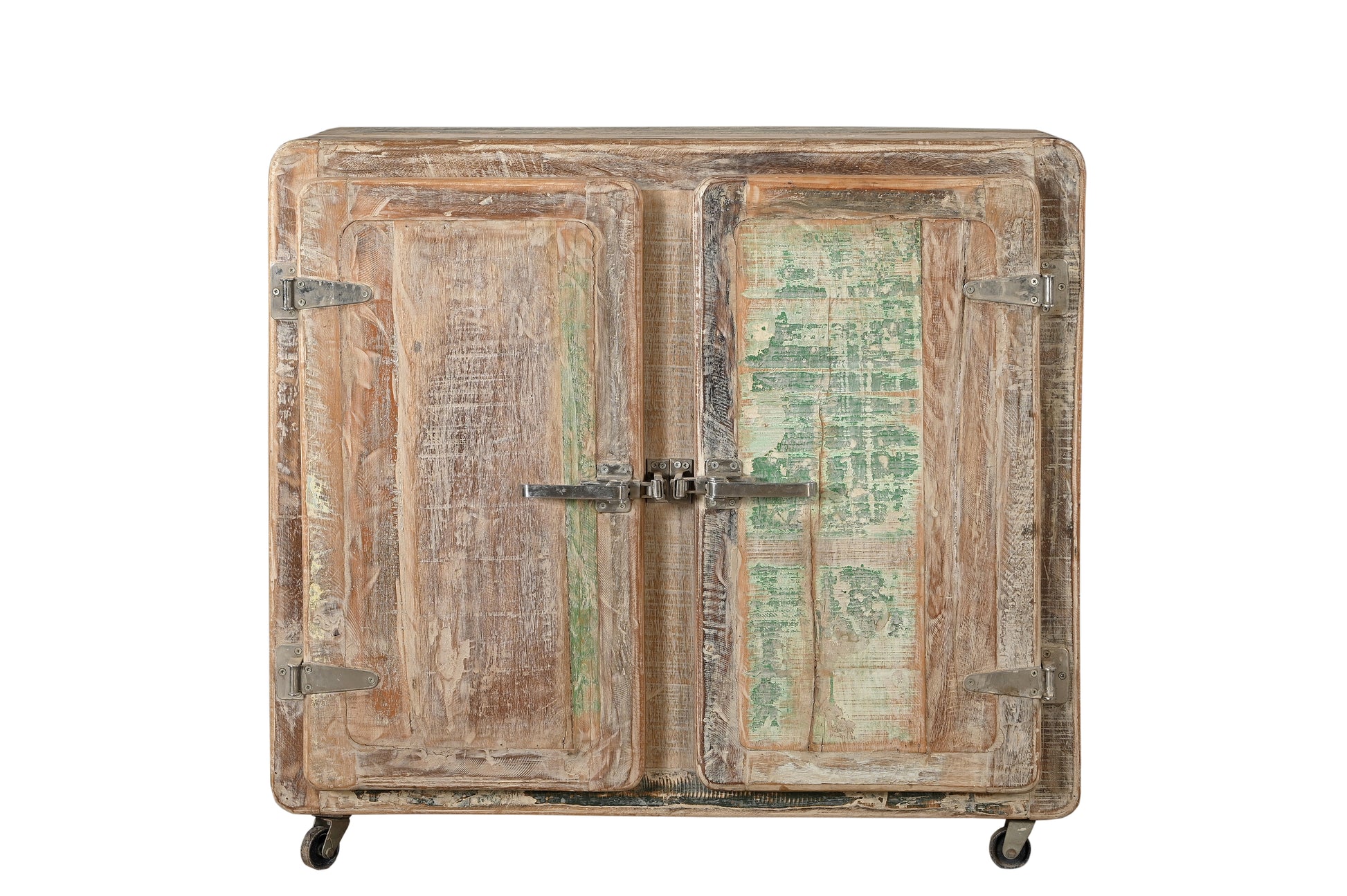 Crafted from recycled wood, this vintage Indian cabinet features soft rounded corners, iron latches, and wheels perfect for mobility - a nod to its past life in the bustling atmosphere of an Indian warehouse.