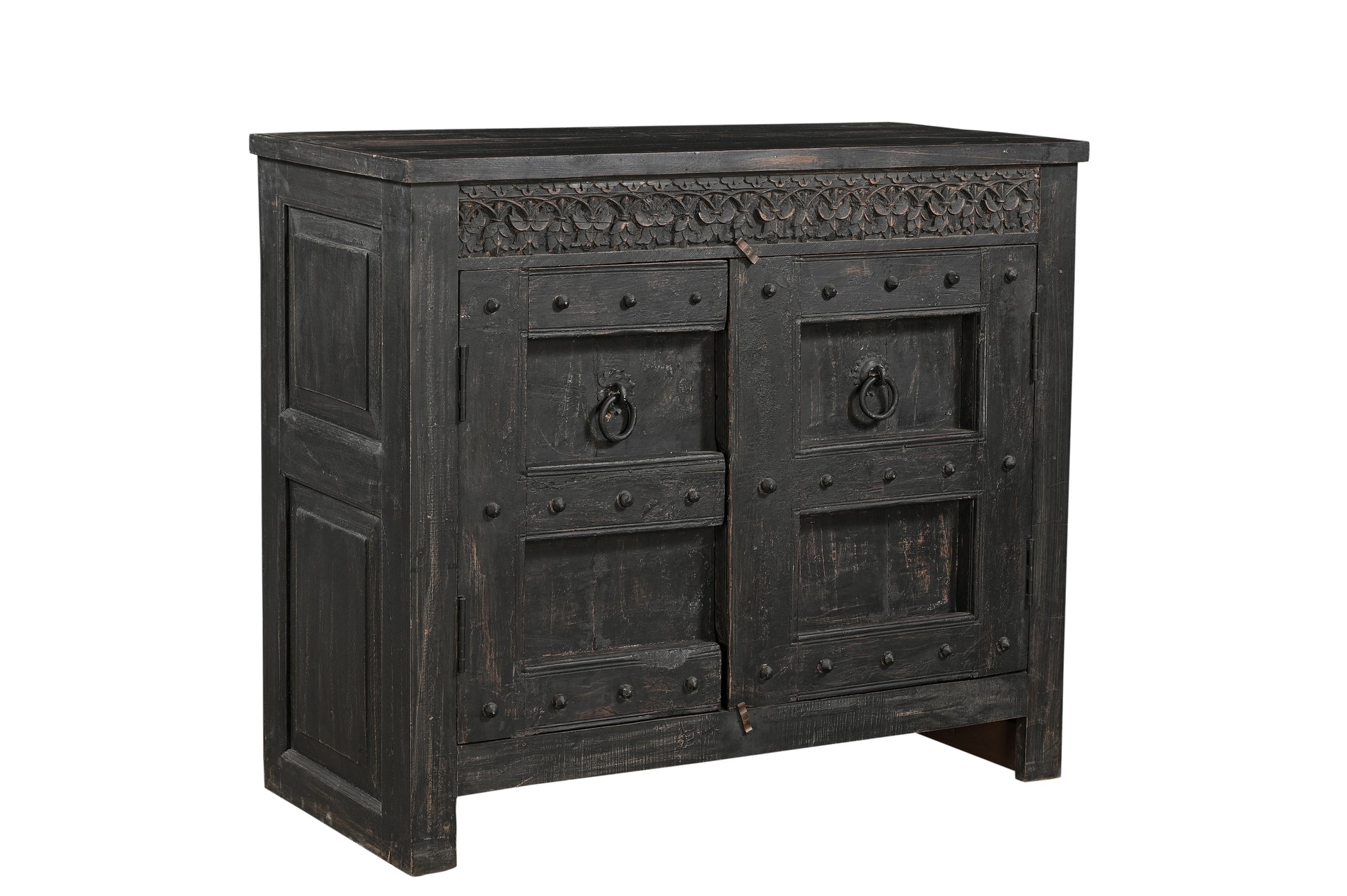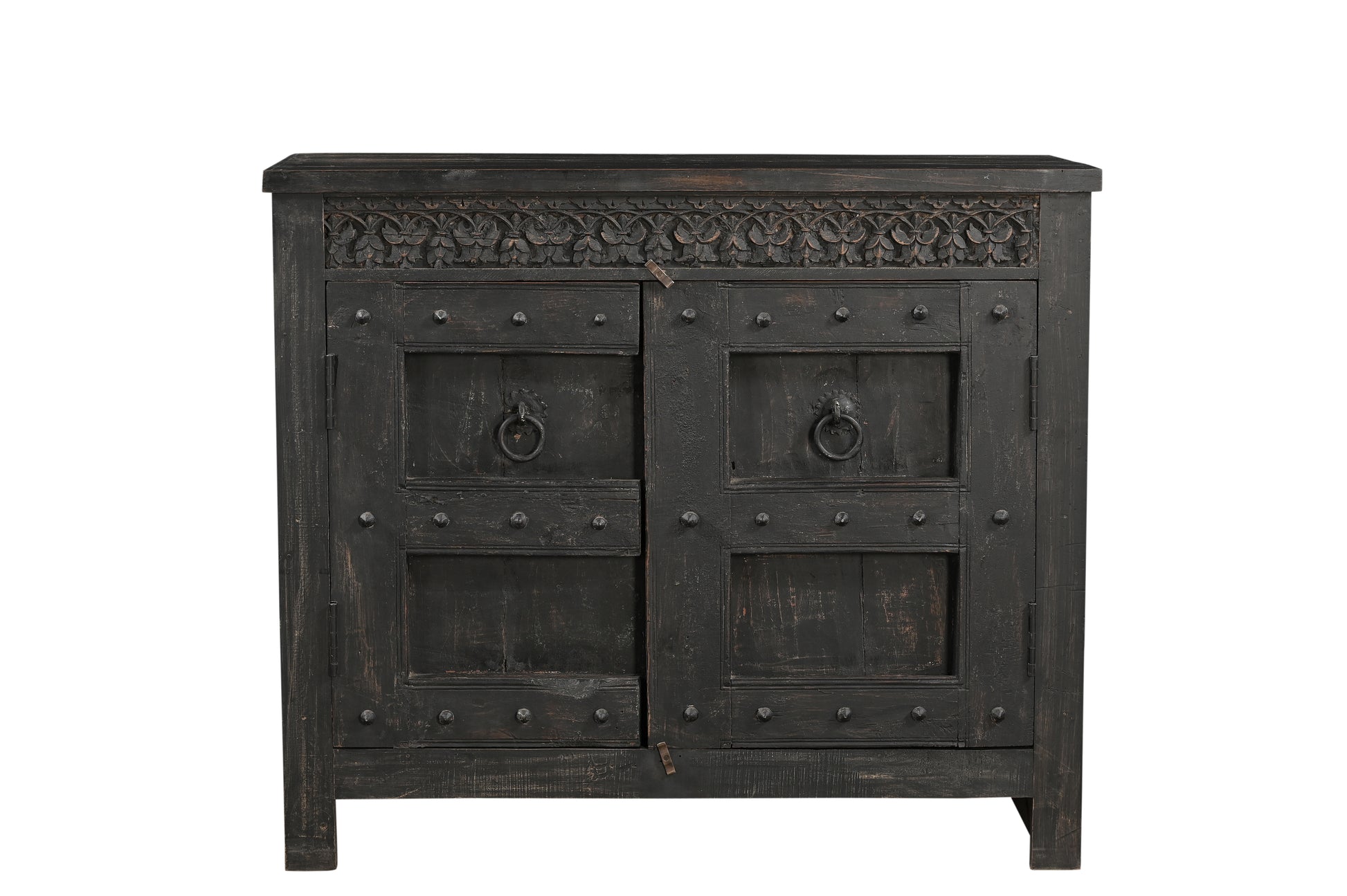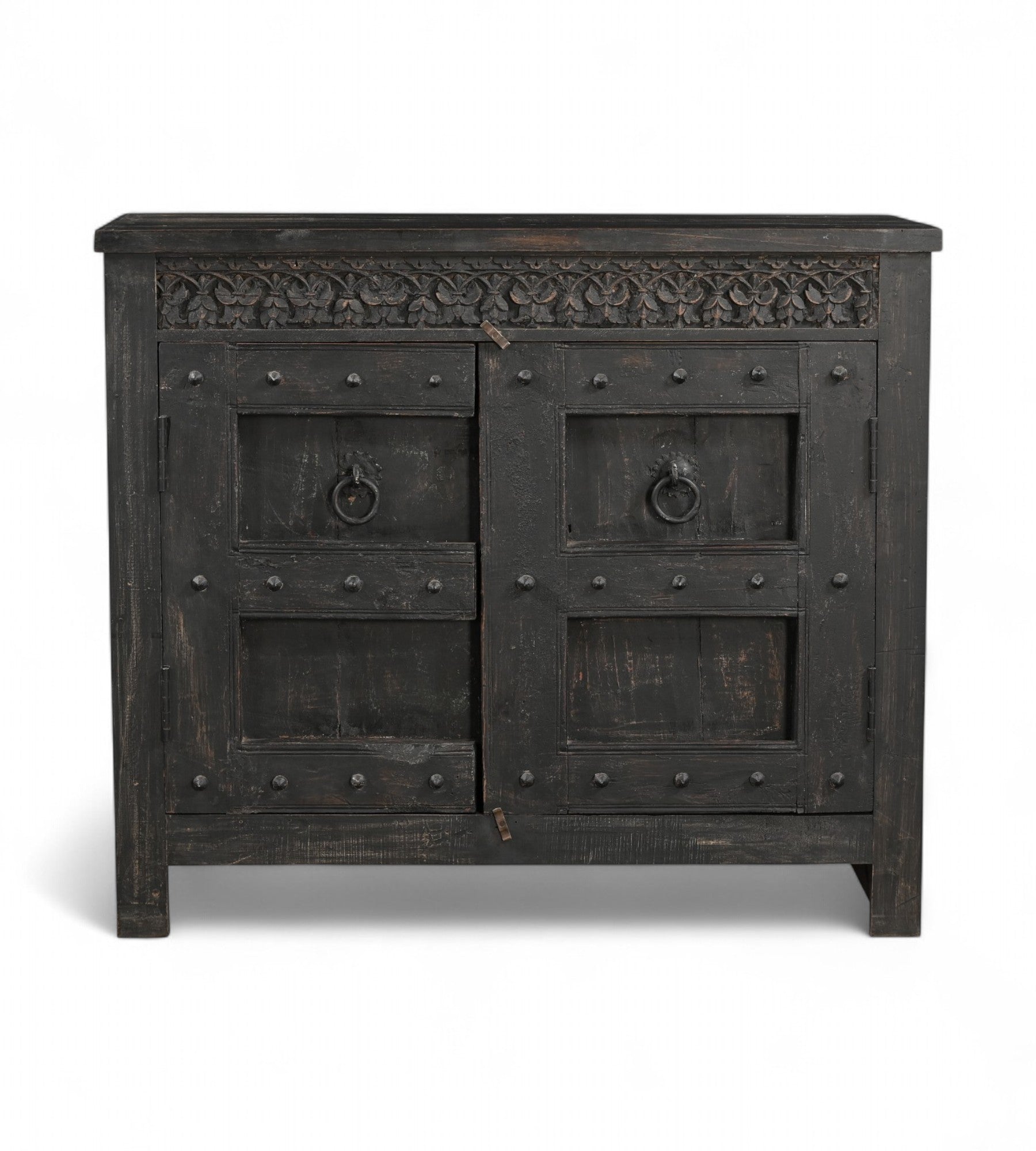 This Indian cabinet pairs vintage teak with salvaged wood and iron. A carved floral frieze across the upper front section of the cabinet softens the fortress like doors giving the cabinet an elegant yet industrial feel.