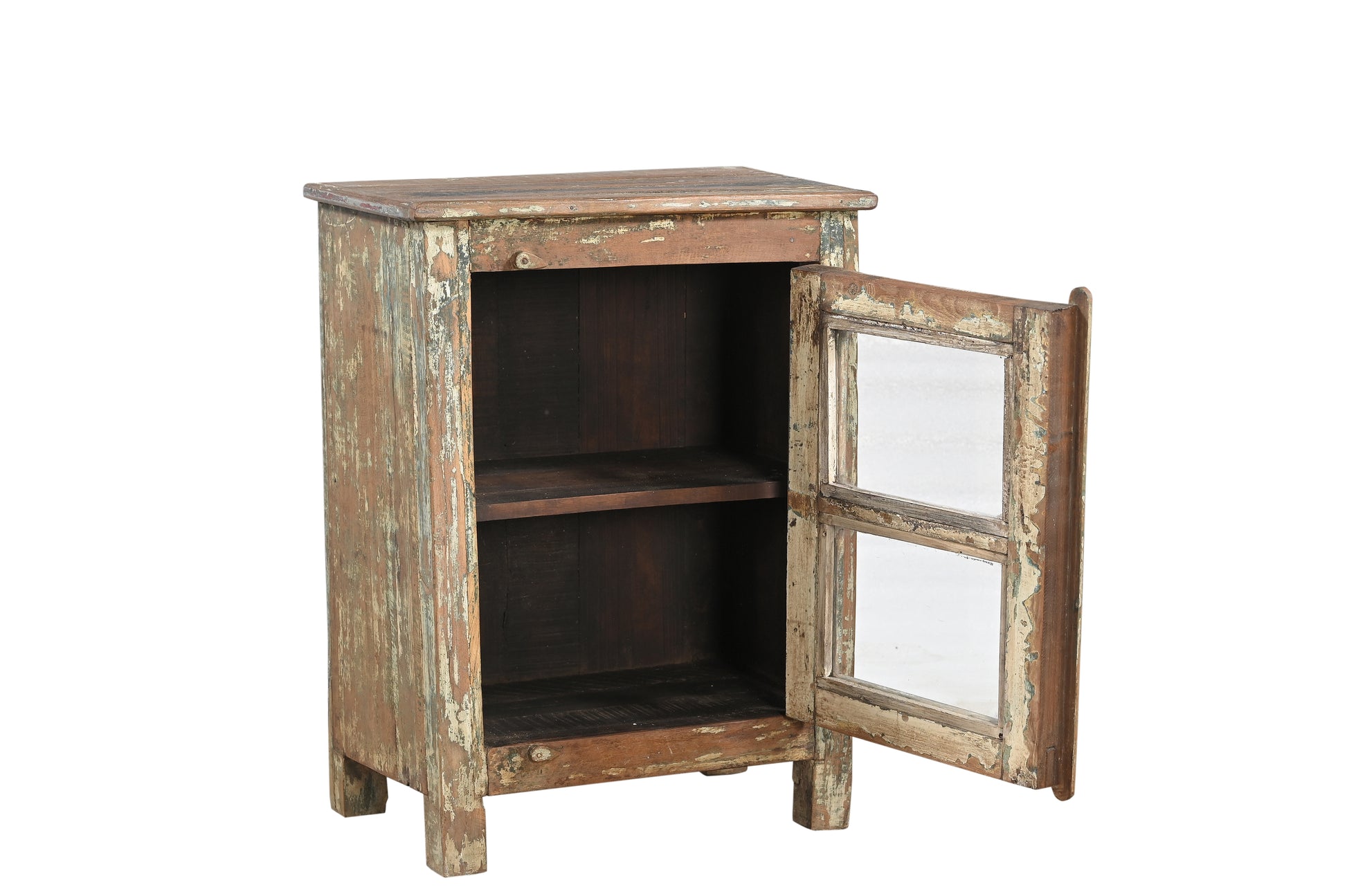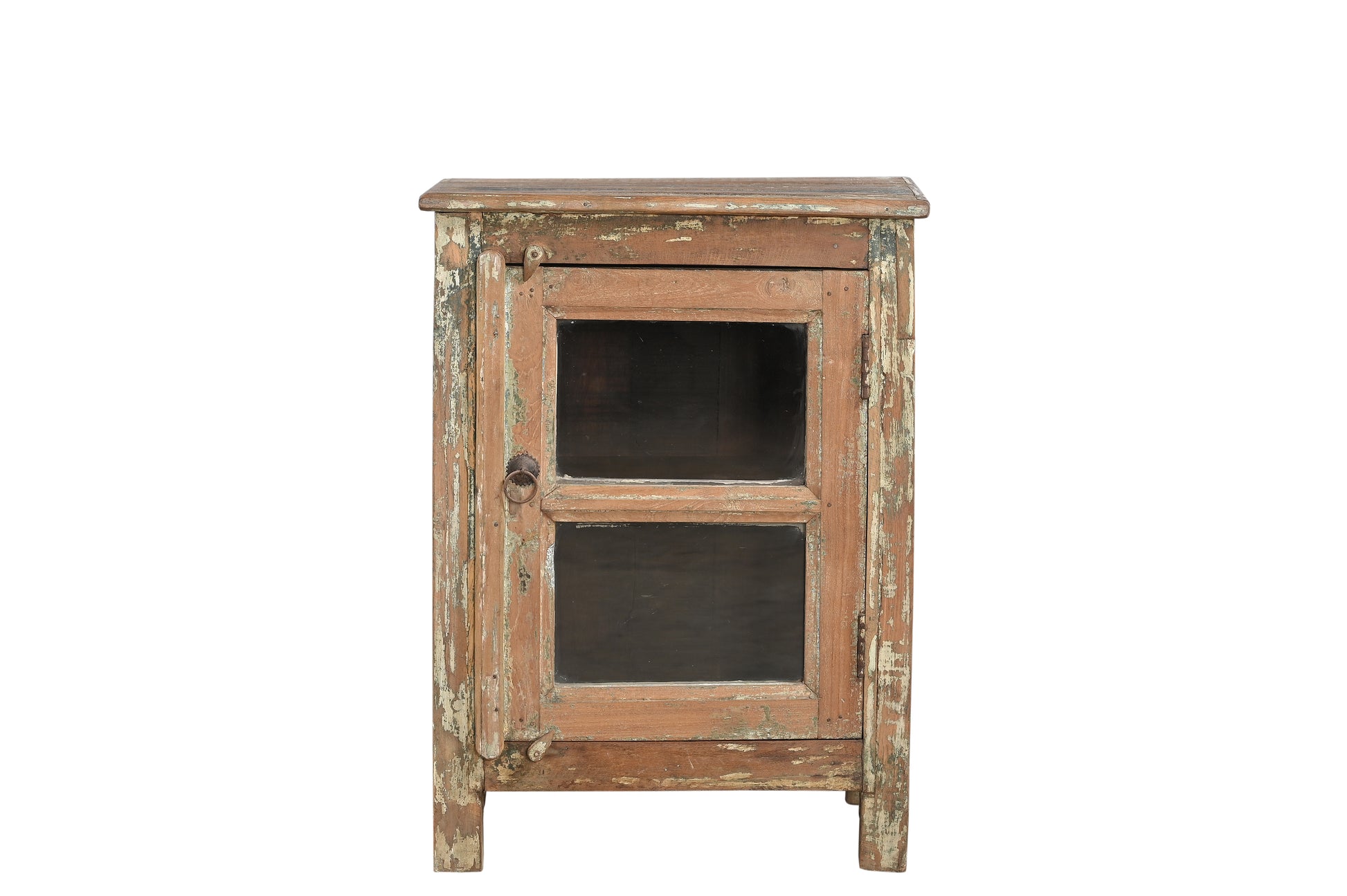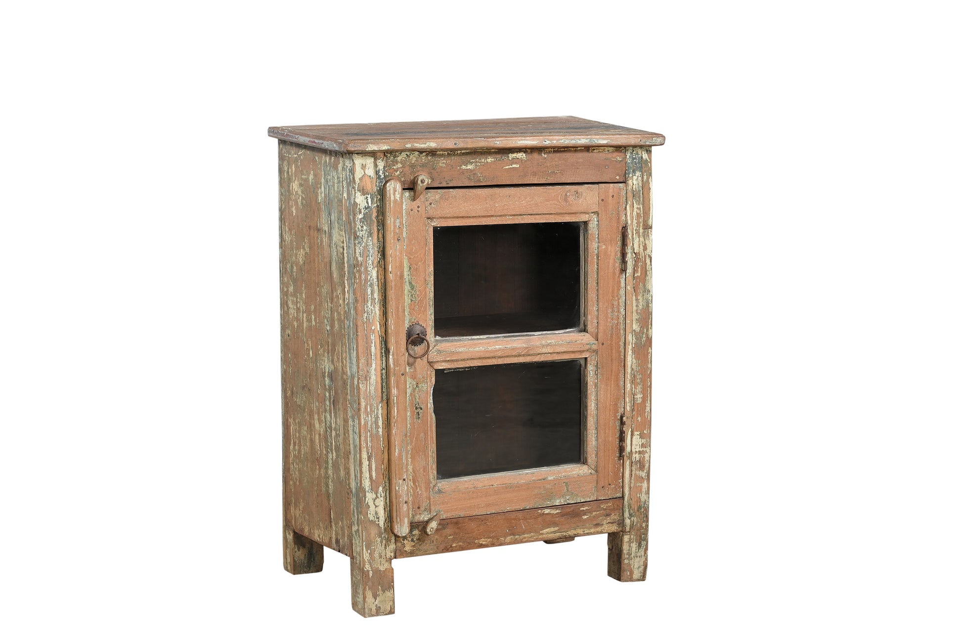 Sourced from India, this vintage piece features a single glass door and metal pull ring, revealing a single shelf inside.