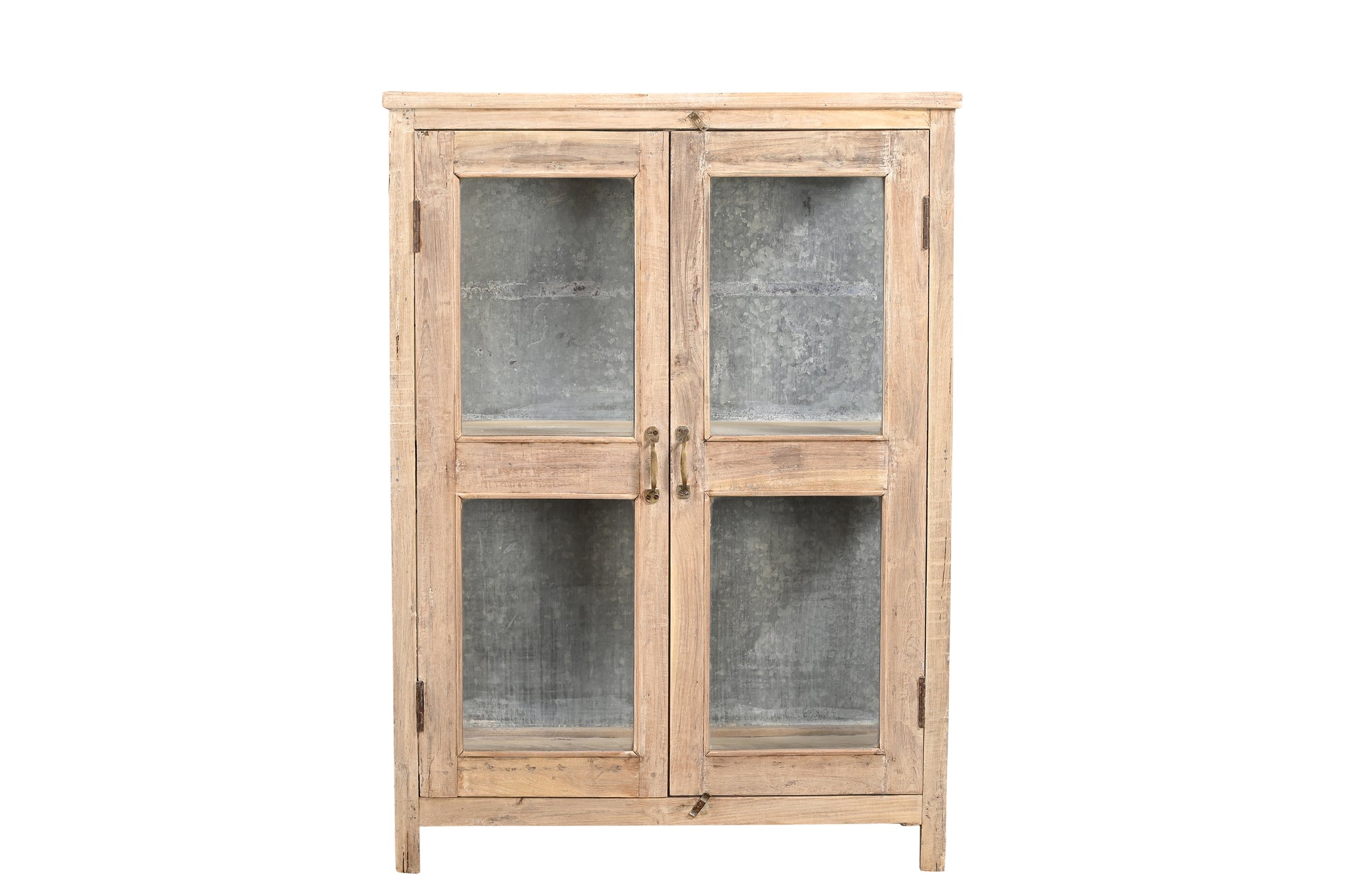 Hand-crafted from recycled wood with a soft sun finish, this vitrines features glass panel doors and an iron sheet backing - giving the cabinet a nice balance between rustic charm and industrial edge.