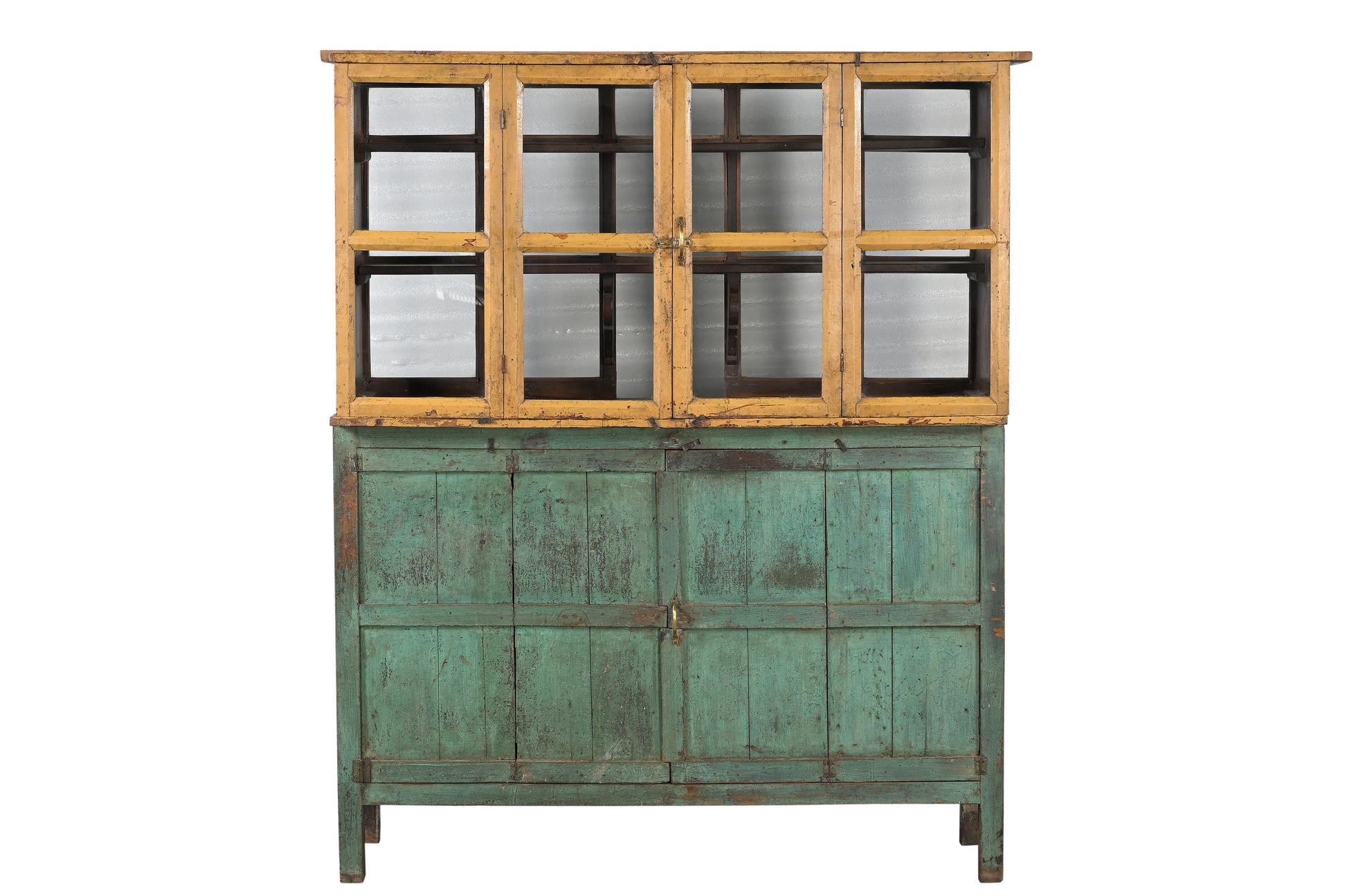 The cabinet showcases a beautifully timeworn patina in faded greens and ochres, paired with a gorgeous mix of wood and glass. Its upper shelf offers display space for ceramics, glassware, or collectibles, while the lower section provides hidden storage.