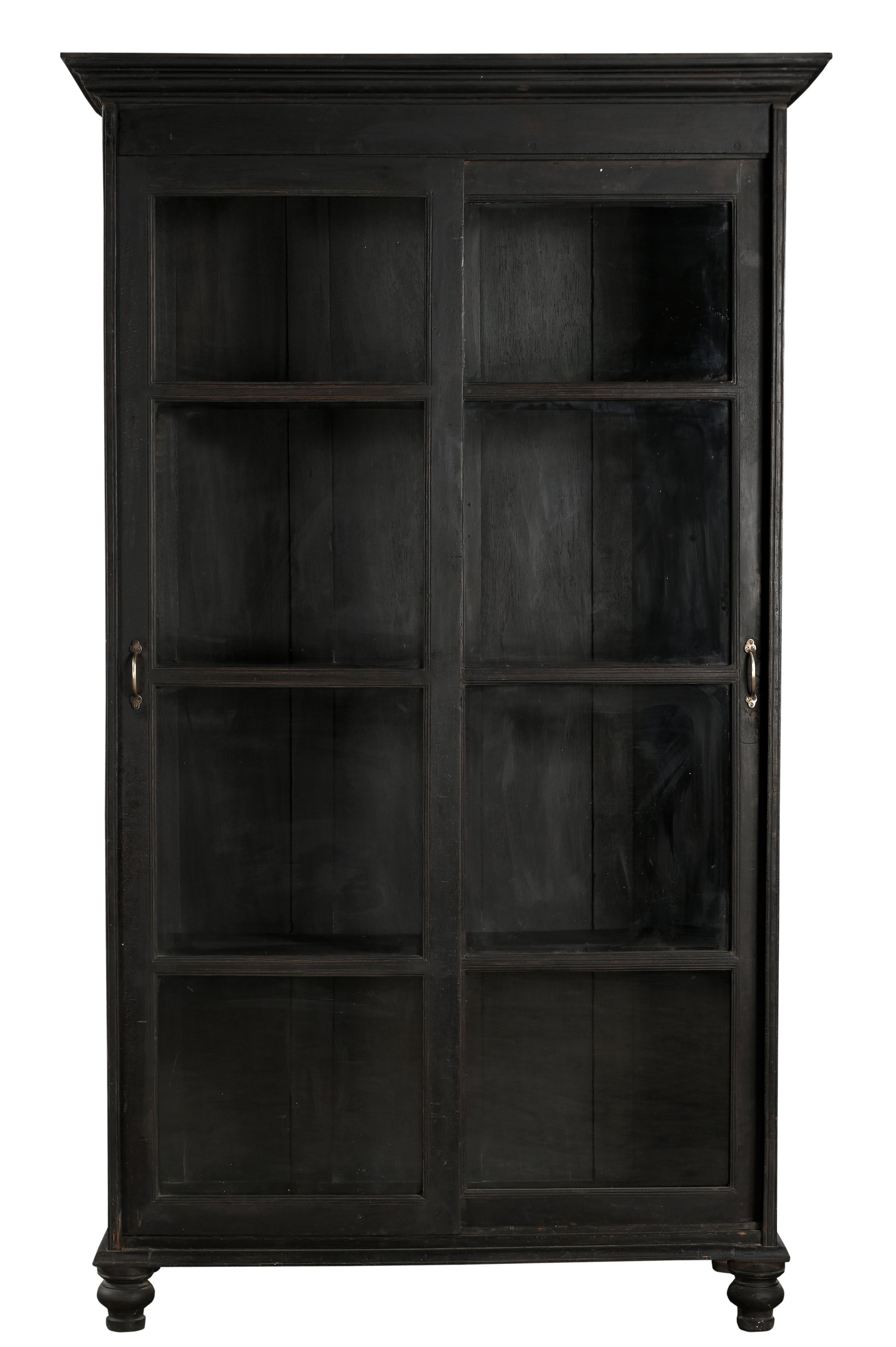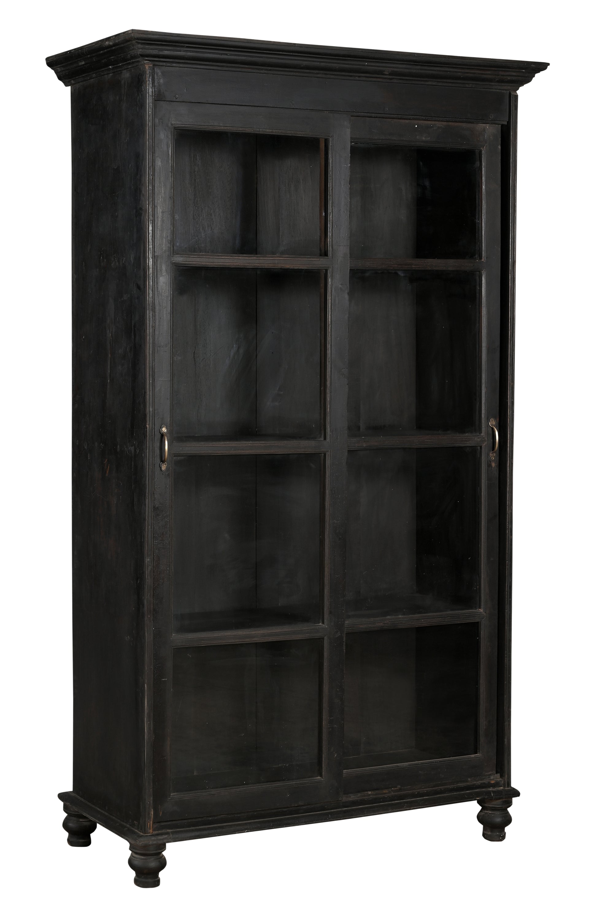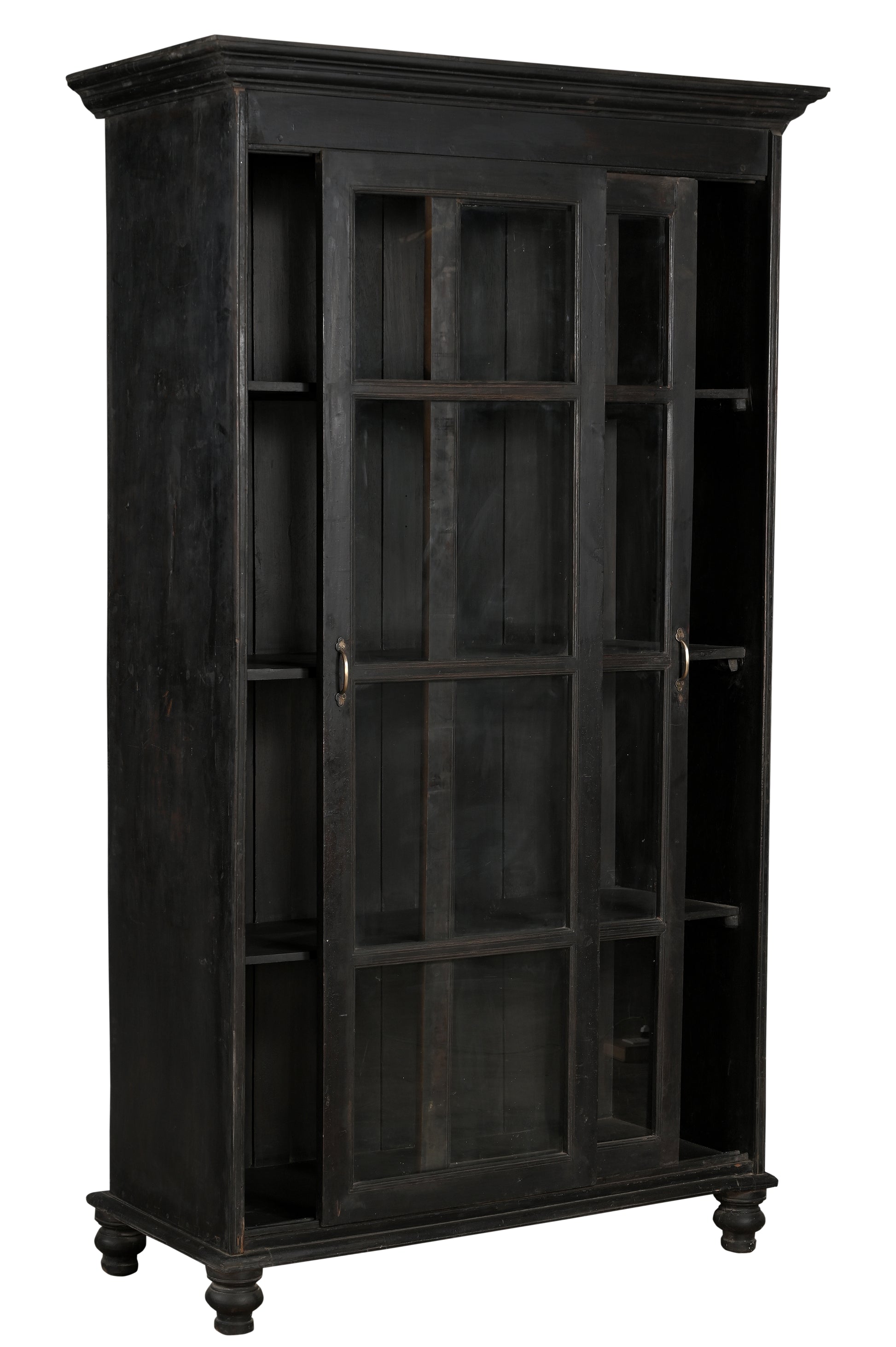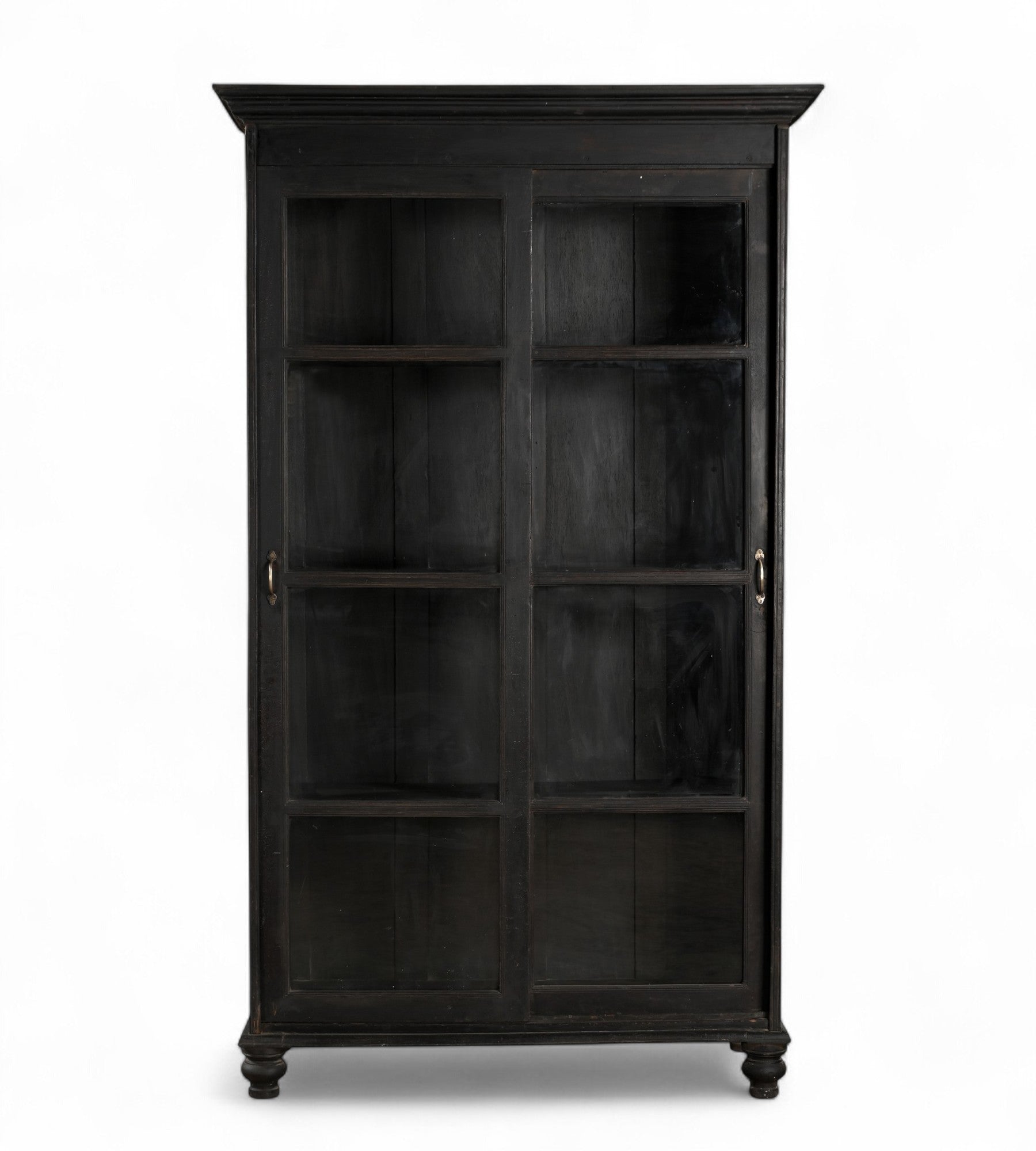 This vintage teak wood vitrine was handcrafted in India. Finished with a gorgeous black, brown tone, this piece is designed to bring both elegance and edge to your space.