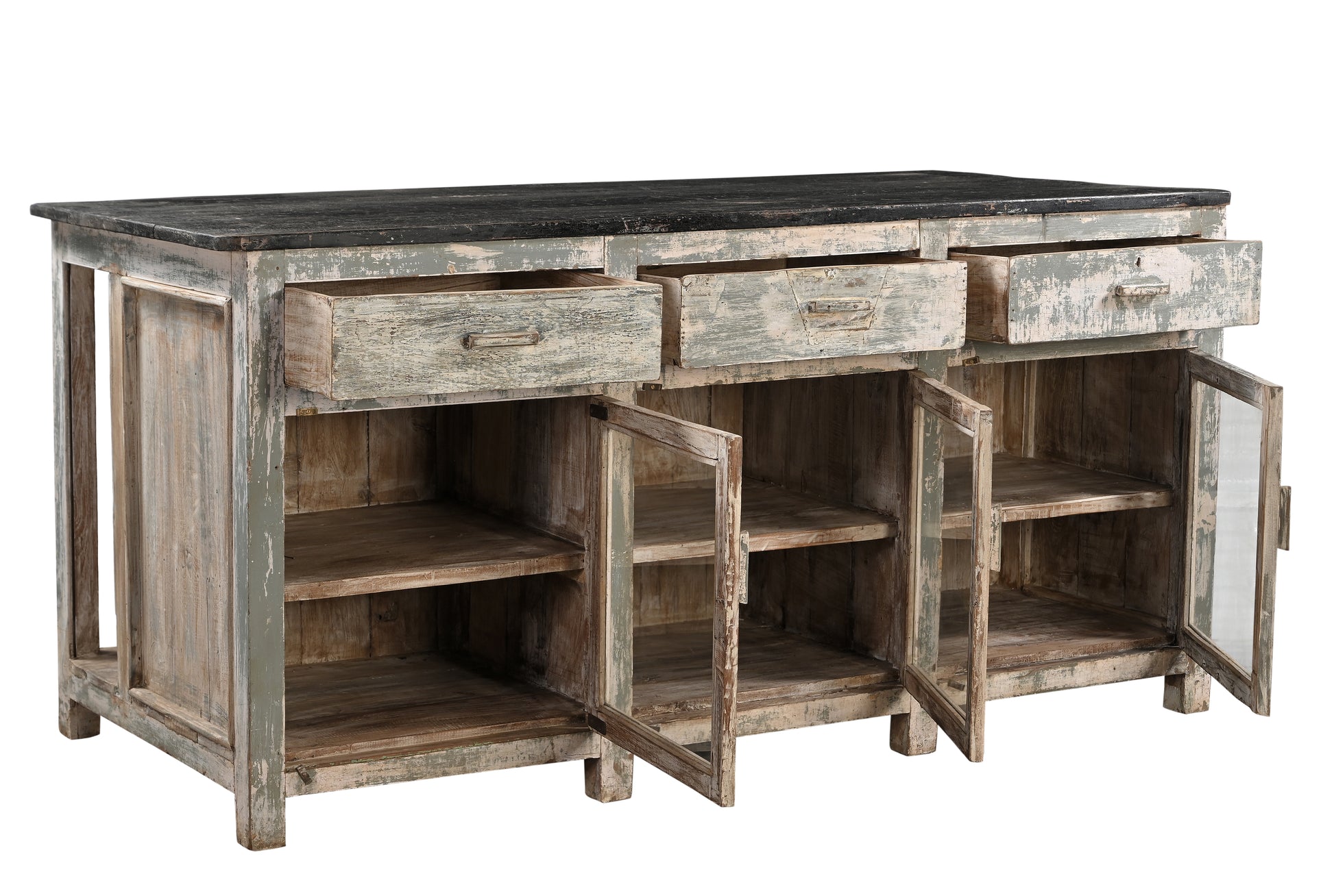 Handcrafted from teak wood and glass, designed with three top drawers and three spacious cupboards below - this cabinet offers sufficient storage for kitchen essentials, making it both functional, stylish and incredibly versatile.