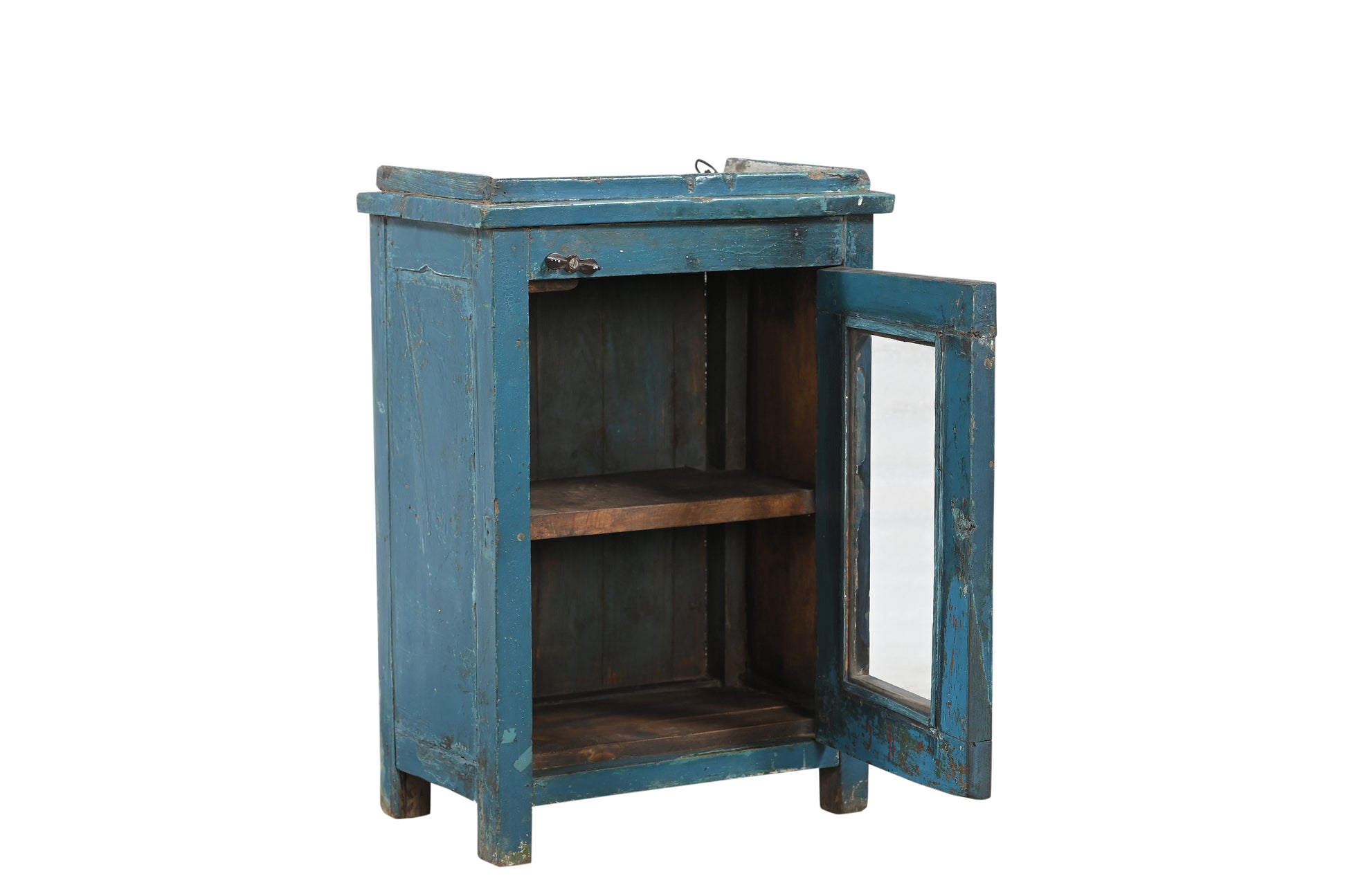 This handcrafted vintage side cabinet is a compact statement in teak. This Indian piece brings rich texture and a pop of colour to any space, the blue paint worn and faded revealing layers of history.
