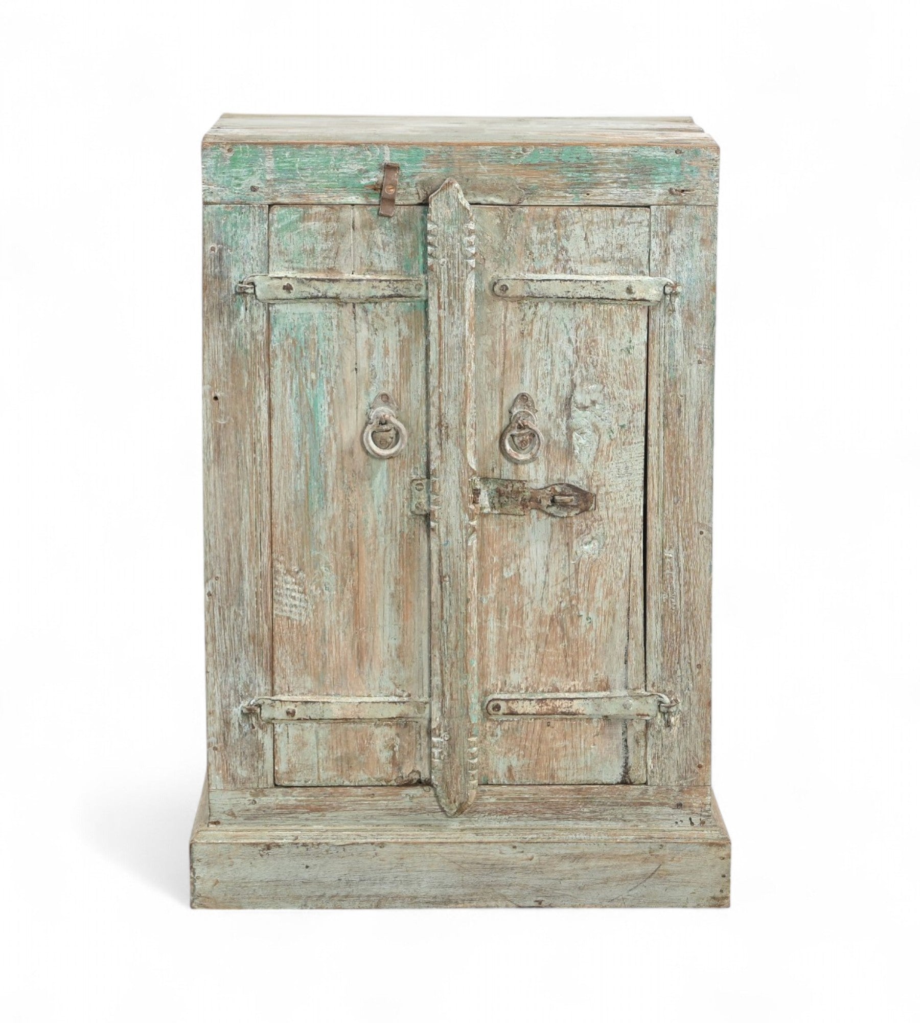 Adding warmth and story to your space, the weathered green patina finish enhances this storage cabinet into a striking statement peace.