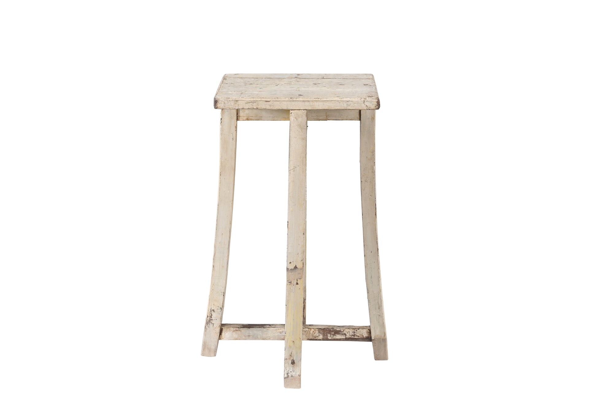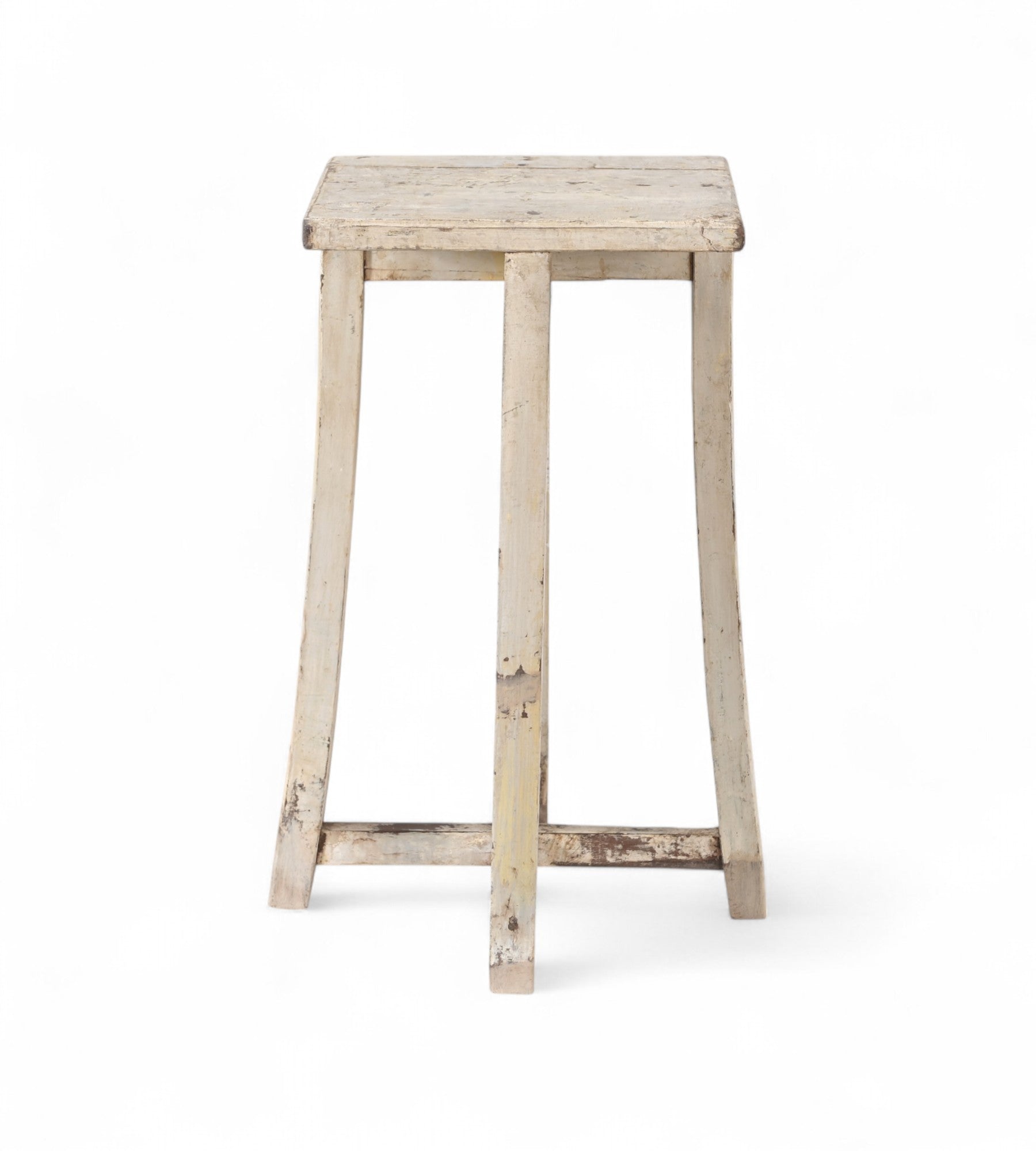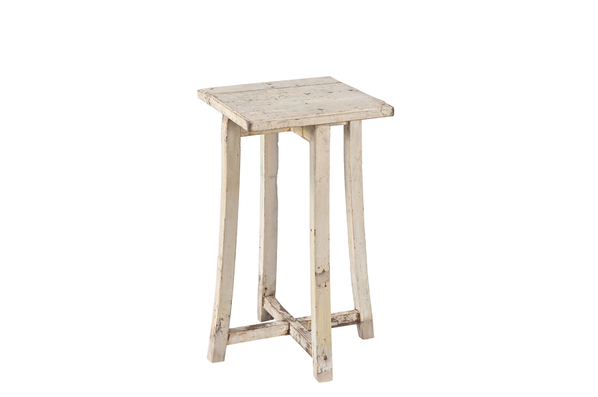 This vintage side table was crafted in India from teak wood and hand washed in a creamy white that has faded with time. The subtly curved legs and cross stretcher base provide added style and uniqueness.