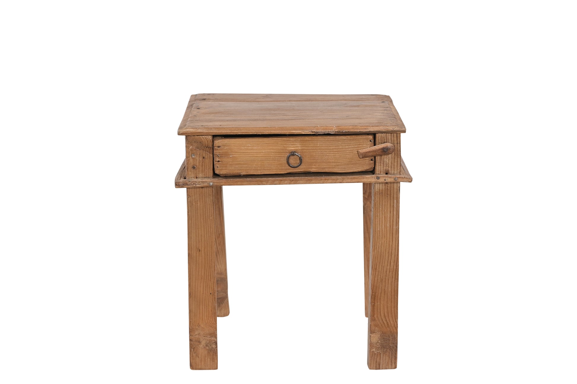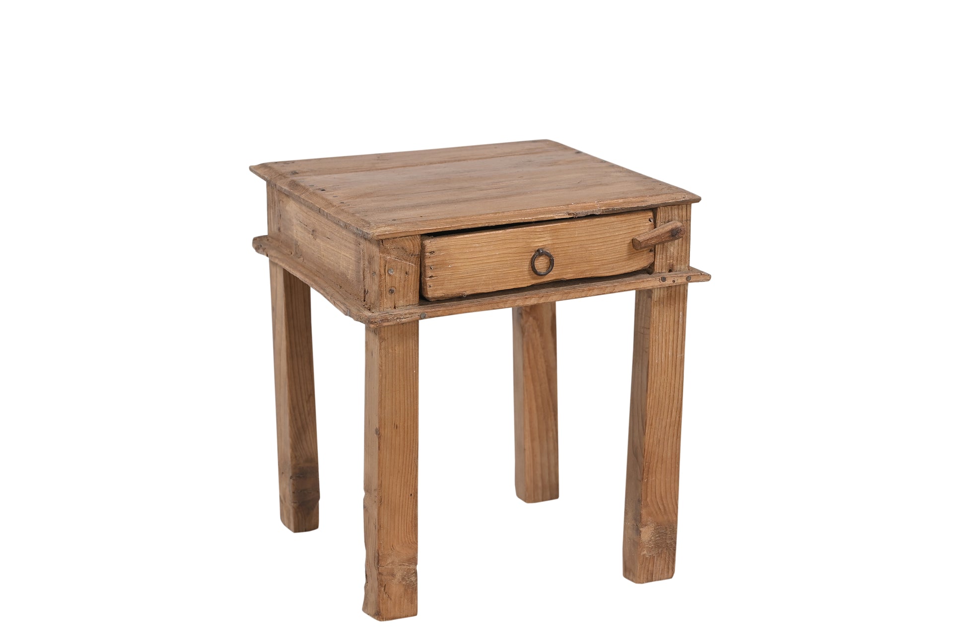 Crafted from teak wood, this vintage side table has a natural finish with a small top drawer adorned with a metal pull ring.