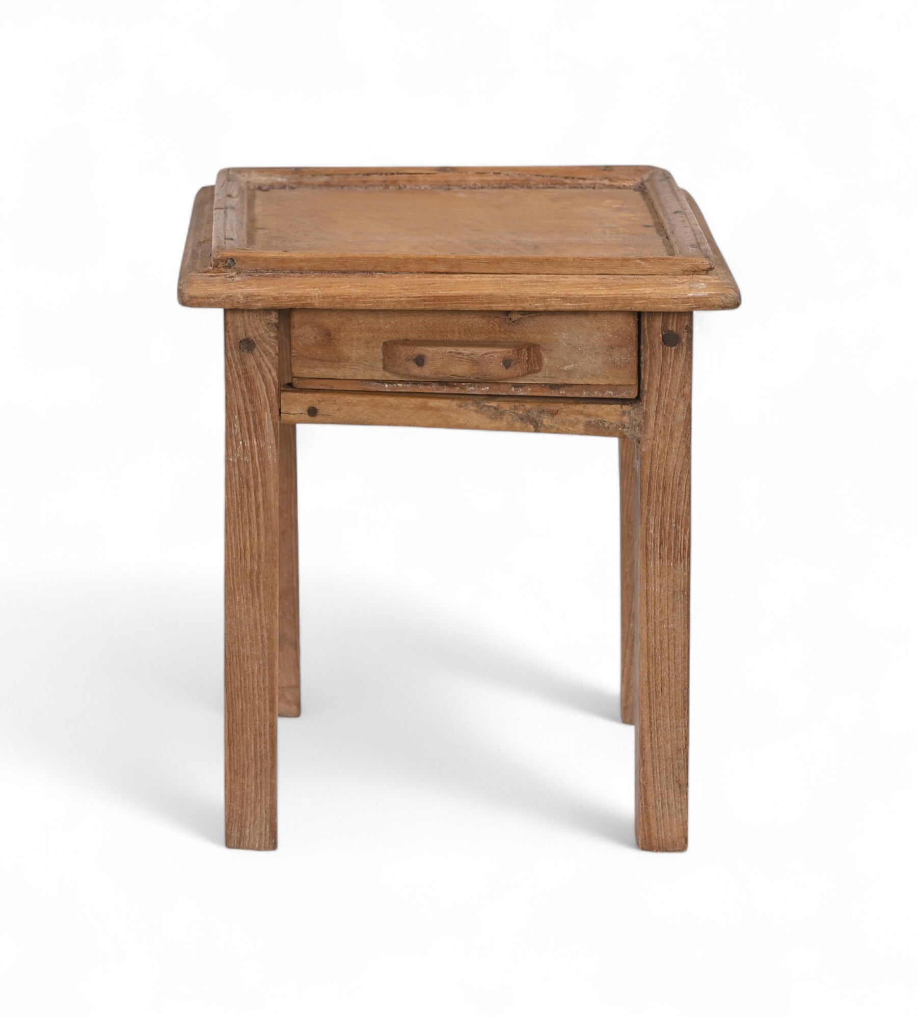 Crafted from teak wood, this vintage side table has a natural finish with a small top drawer adorned with a metal pull ring.
