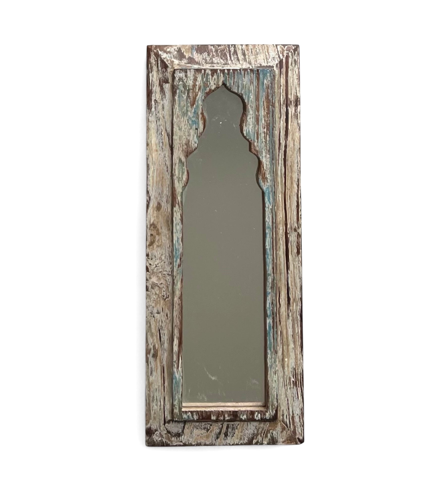 These vintage Indian arch mirrors have been handcrafted from recylced wood. Each mirror is framed with intricately carved wood, its distinctive arch shapes inspired by Rajasthani and Mughal design.