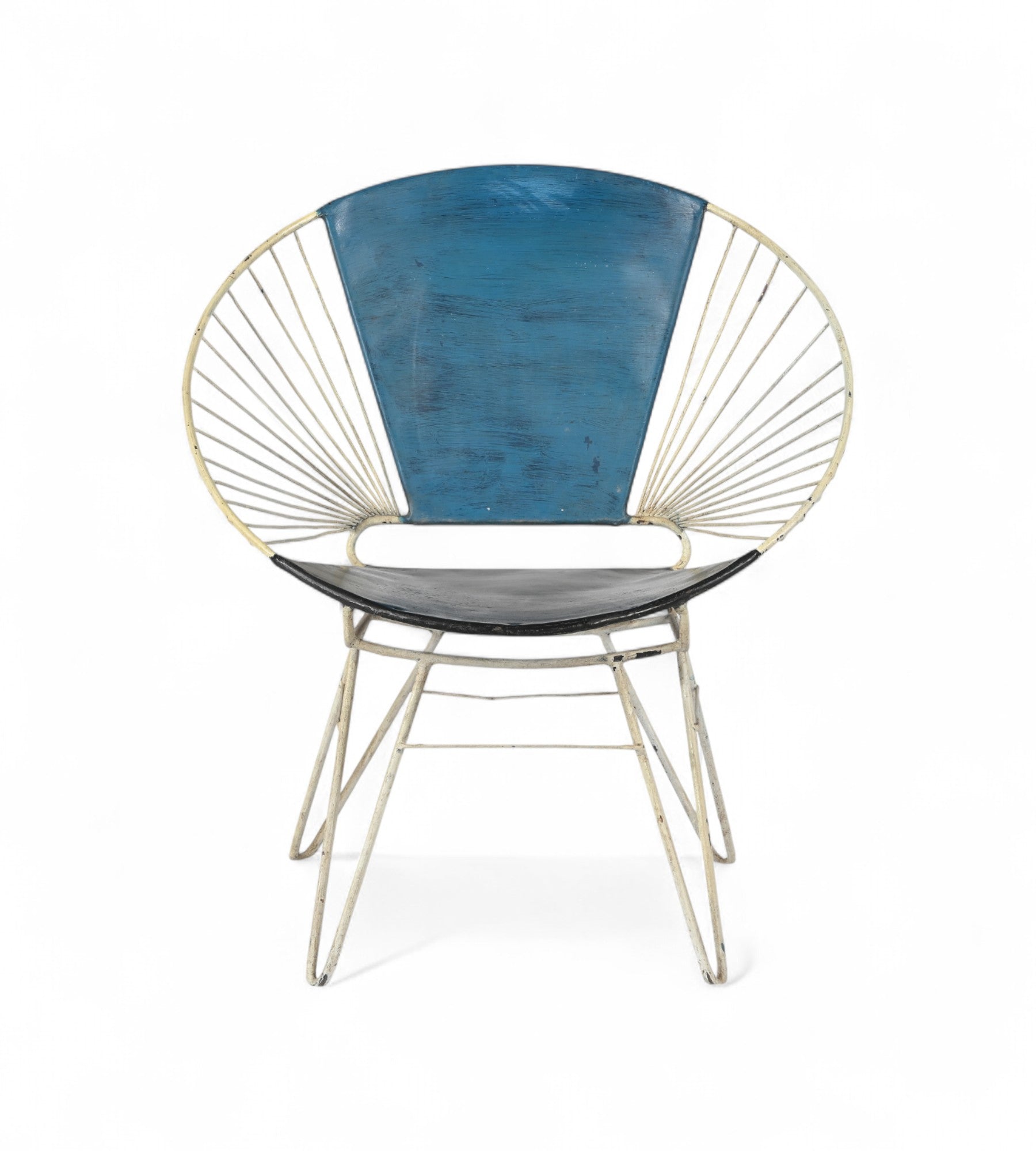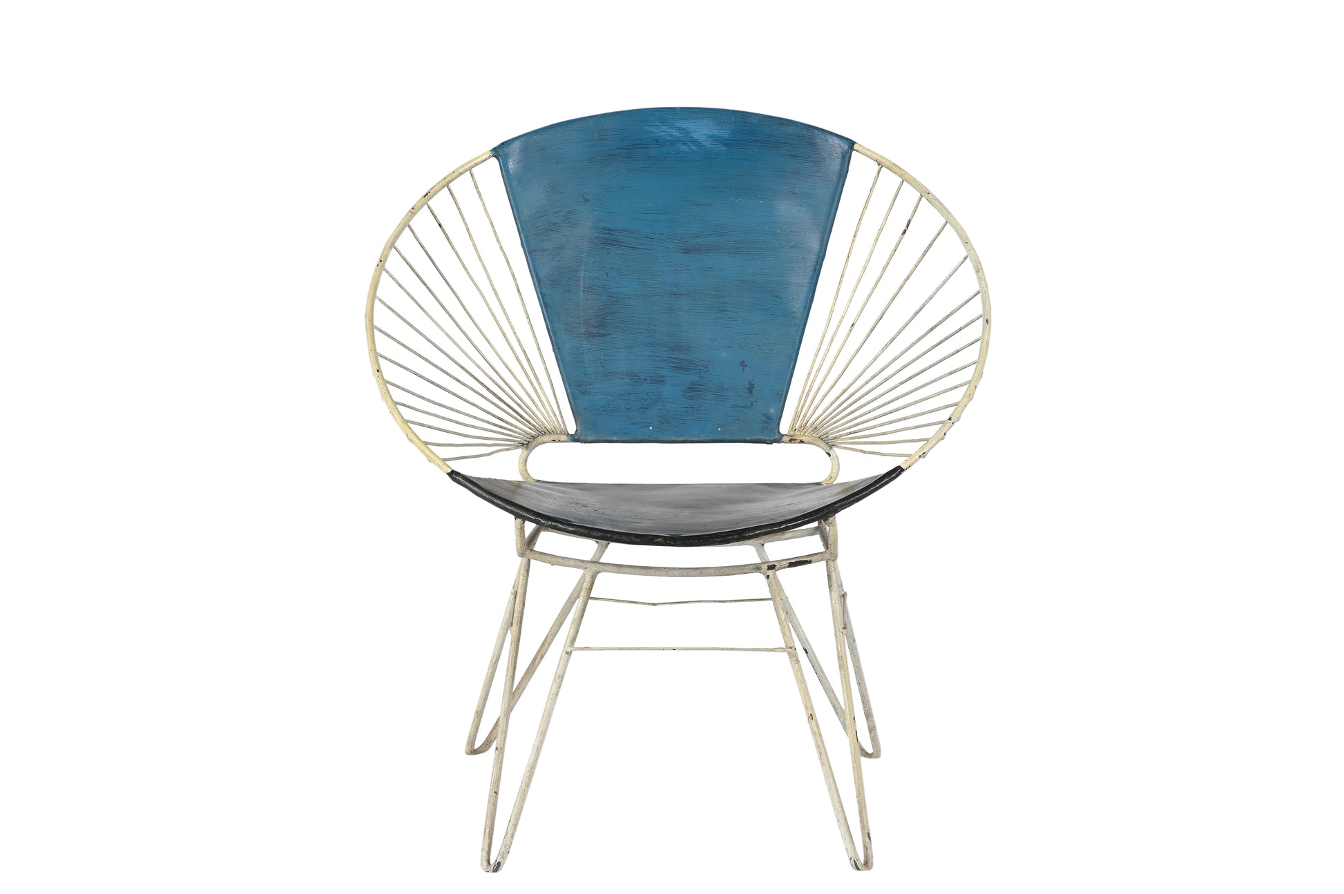 The iron frame of this vintage chair fans outward, cradling a canvas backrest.