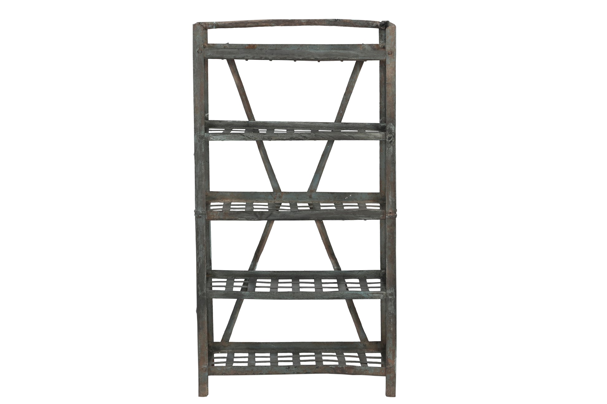 The worn blue grey patina, lattice style type shelves, and visible rivet tell a story of use and work.