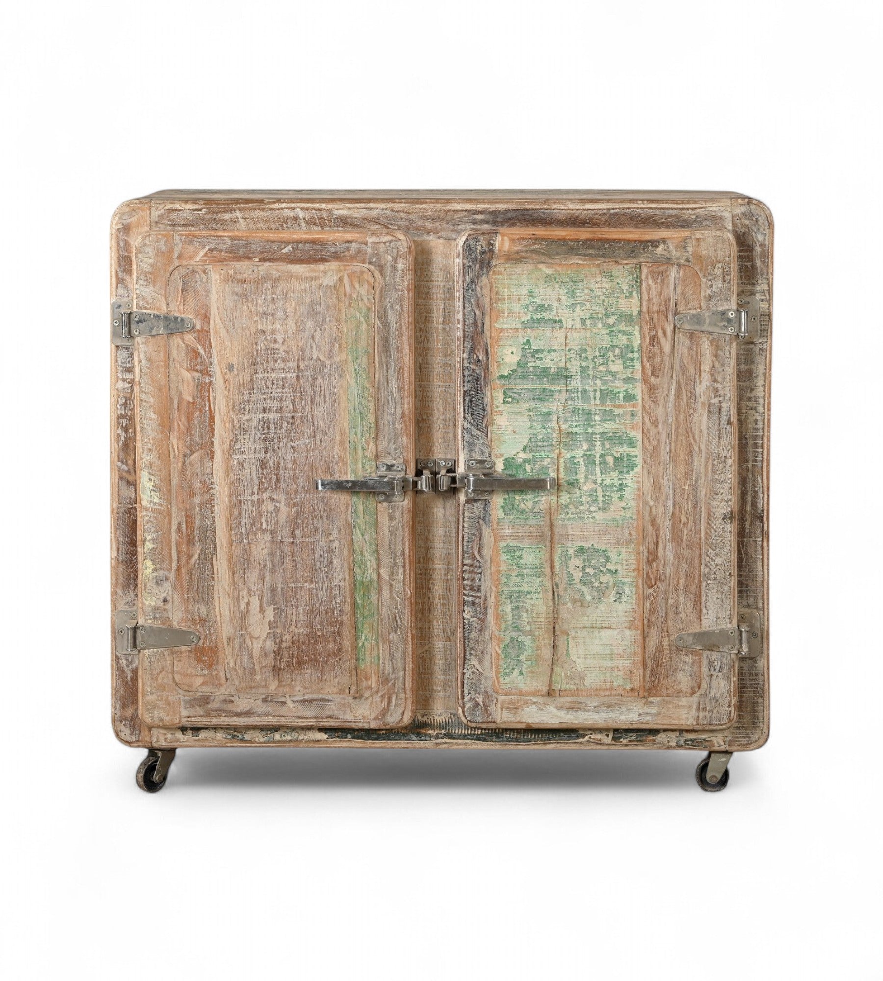 Crafted from recycled wood, this vintage Indian cabinet features soft rounded corners, iron latches, and wheels perfect for mobility - a nod to its past life in the bustling atmosphere of an Indian warehouse.