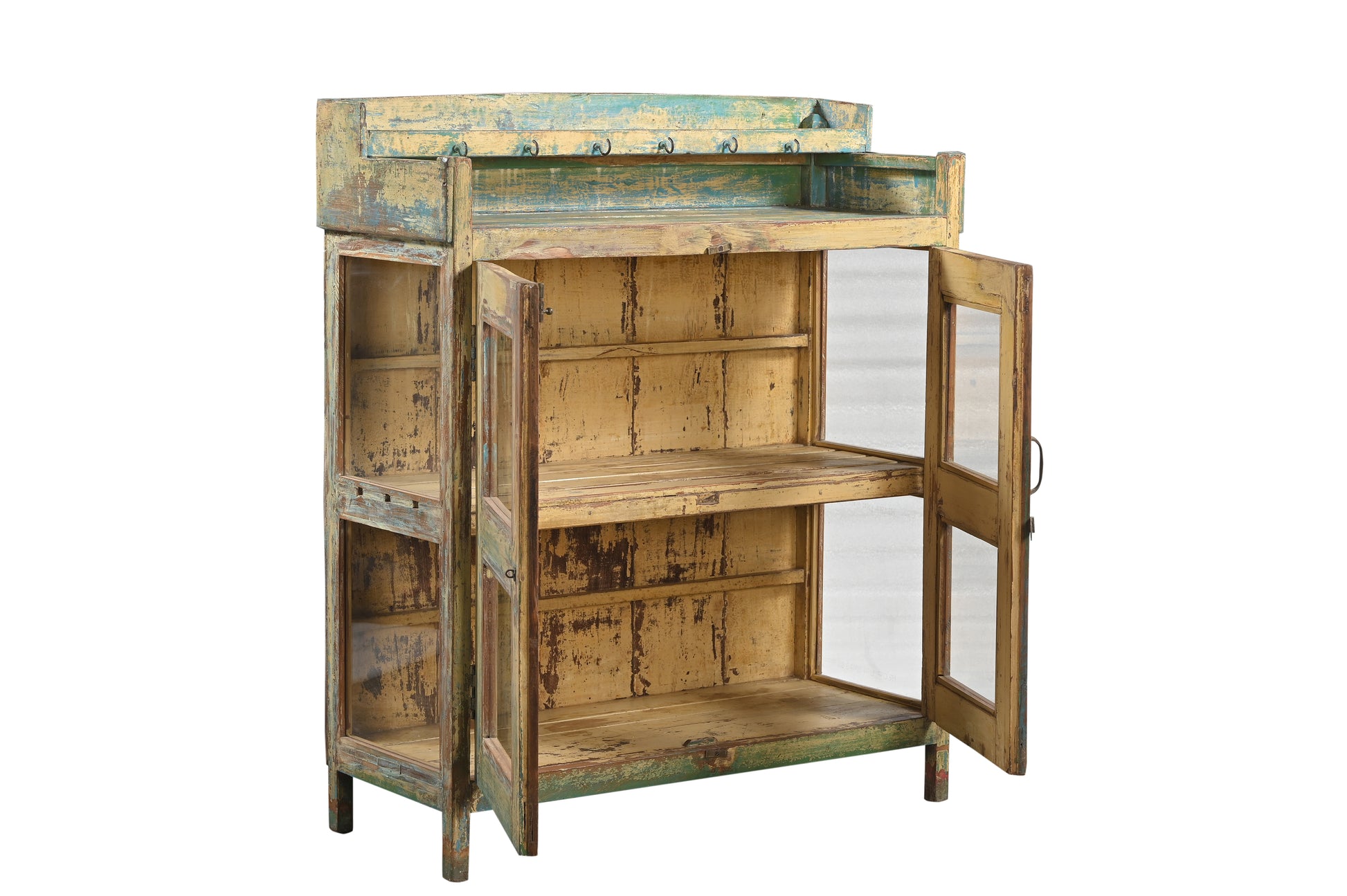 This display cabinet is both joyful and bold, bursting with character. This vintage glass cabinet, was handcrafted in India and made from recycled wood - a gorgeous functional piece that adds character to any space. The aged paint - soft yellows, weathered green with touches of turquoise really make this a standout piece.