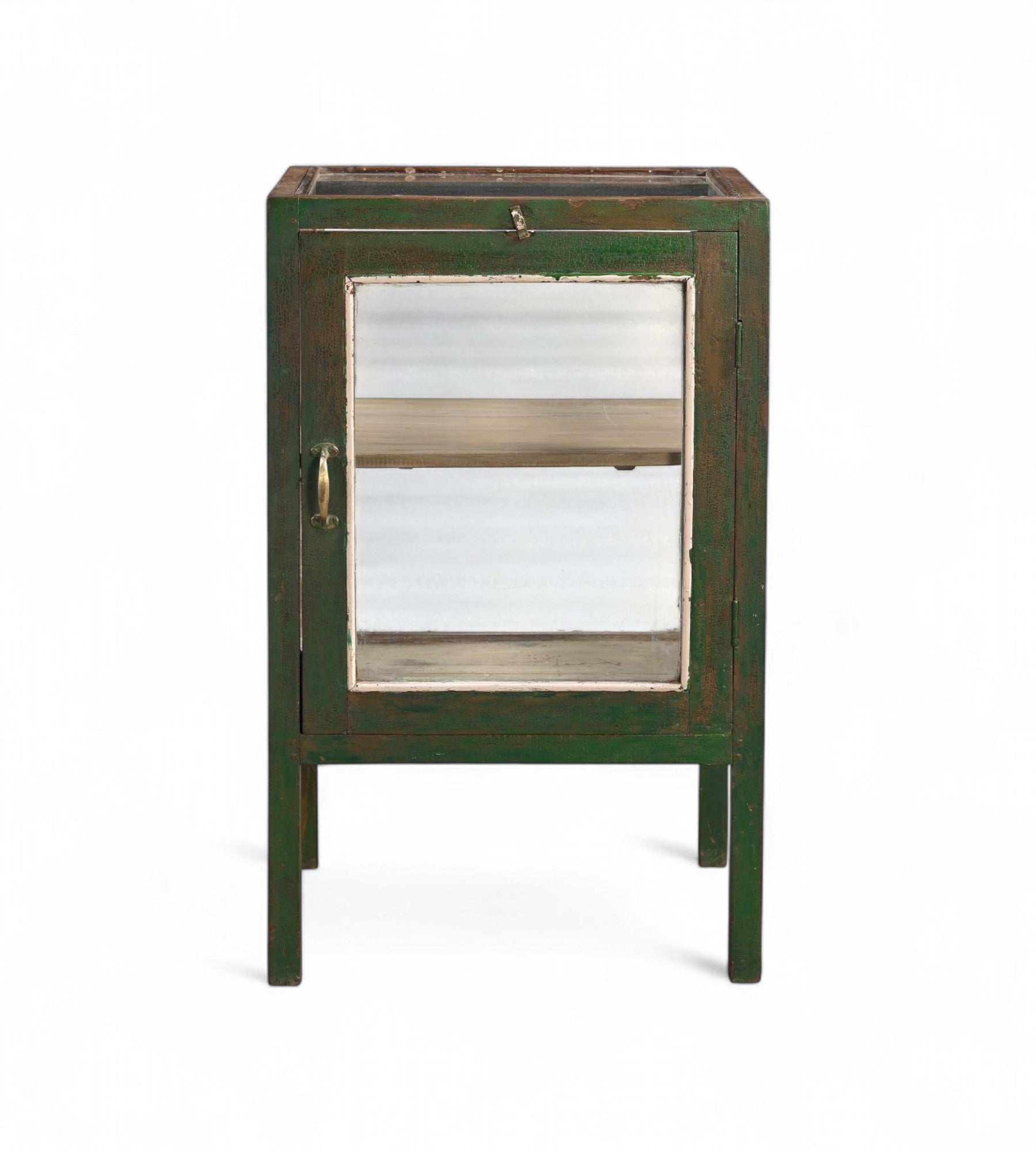This hand washed weathered green cabinet is perfect for displaying ceramics and collectibles that deserve to be seen, while the aged brass hardware and gently worn wood, add texture and timeworn charm.
