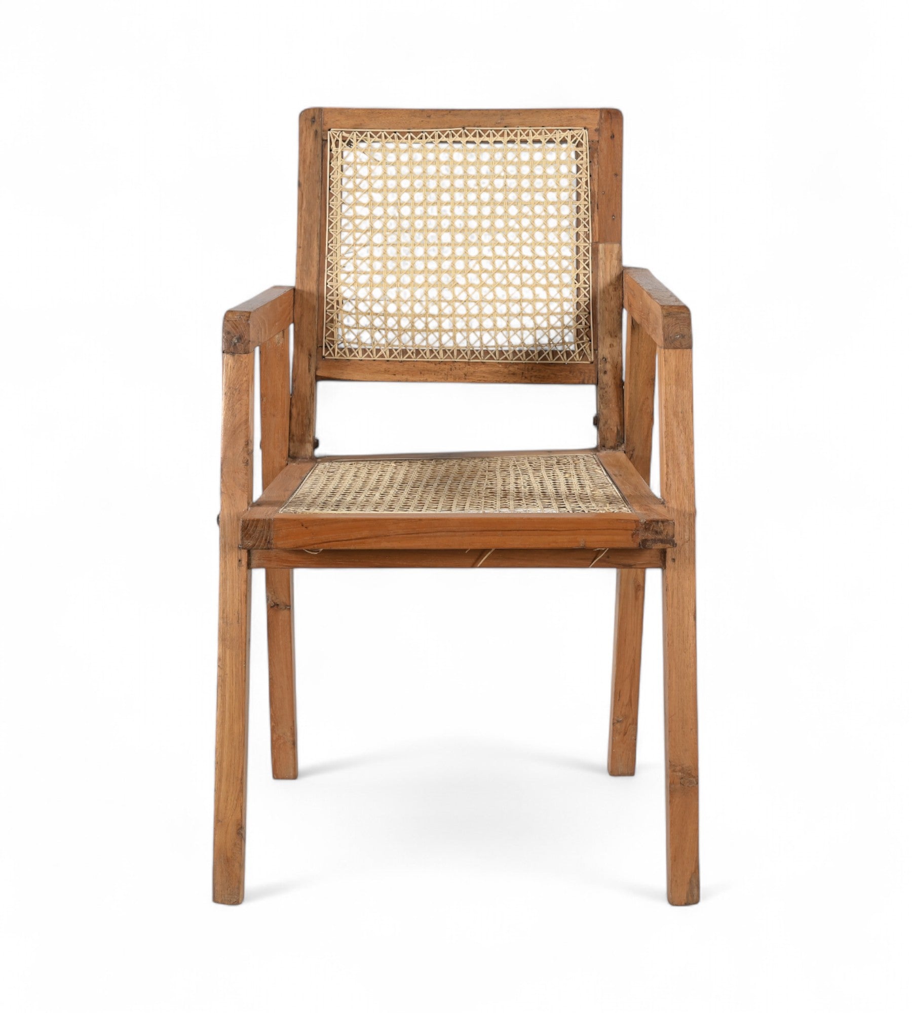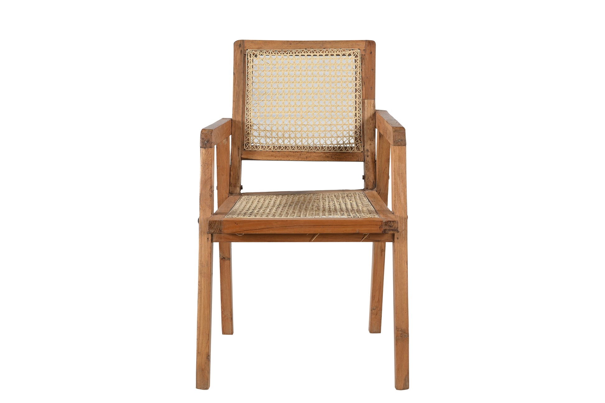 Striking in its simplicity, this vintage armchair brings together the strength of solid teak and the airiness of hand woven rattan. Its angular legs and clean lines offer a beautiful structure.